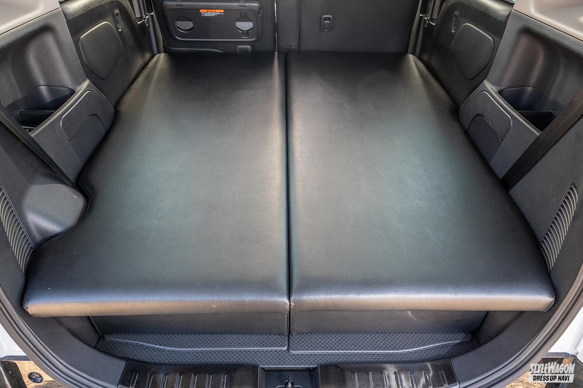 後席を倒した上に設置するデリカミニ専用のベッドキット。工具不要で組み立てることができるのでDIYなどに不安がある人でも楽々取り付けられる。オプションとなる専用クッションを組み合わせることで、約1600mmの奥行きを確保することができる。約30mmのクッションを内蔵しているので寝心地も抜群で、大人3人が乗ってもたわまない耐久性を確保している。