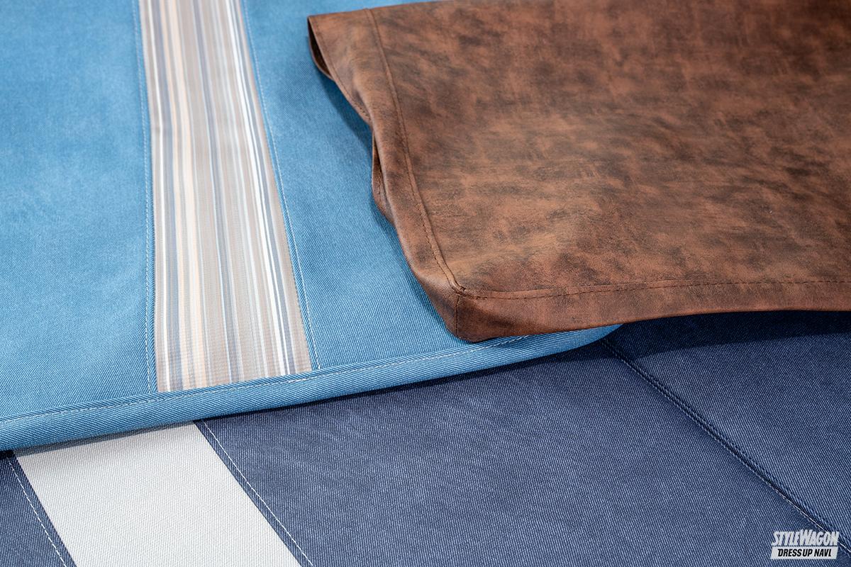 一般的なシートカバーと同じく、仕組みはベッドキット本体に被せるだけという簡単設計。その特徴は、ラインアップされる3色がどれもオシャレで魅力的であるということ。撮影車両に装着された「インディゴブルー」は深みのある青に爽やかなホワイトラインが入るカジュアルな仕立て。明るい青にパステルカラーのストライプラインを入れた「ライトブルー」は車内の雰囲気を一気に明るくしてくれる爽やかなカラーリング。そしてレトロな雰囲気を作り出す「ヴィンテージブラウン」の全3色が用意される。また生地表面には、付着した細菌の増殖を抑制する抗菌効果も備えている。レギュラーカラーの「ブラックレザー」ではちょっと物足りない、そんな人に是非おすすめしたい新作だ。