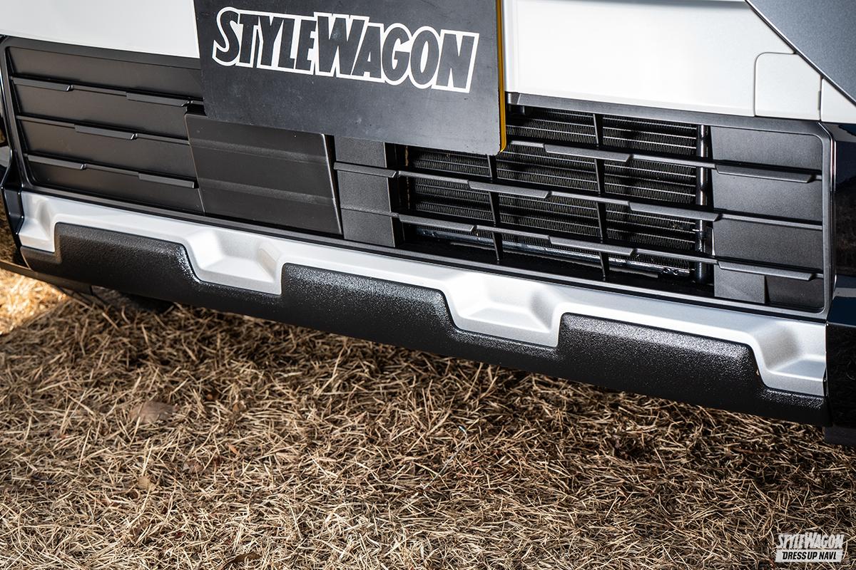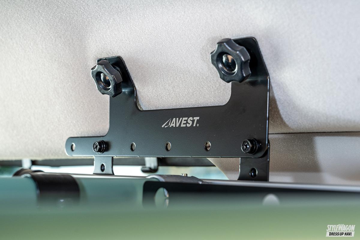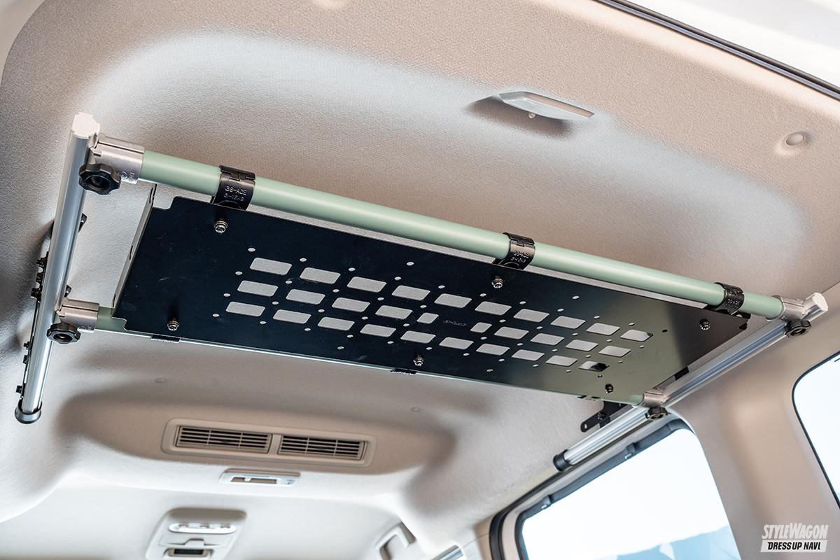 アッパートレーとぜひ一緒に追加したいのがバックドアパイプ。リアゲート室内側へクロスパイプを設置することで、リアゲートを開けたときにウェアやバック、ランタンなどのアウトドアギアを手軽に吊るすことができる。アッパートレーと同じ全3色をラインアップしているので、ぜひ同じ色でコーディネイトしたい。