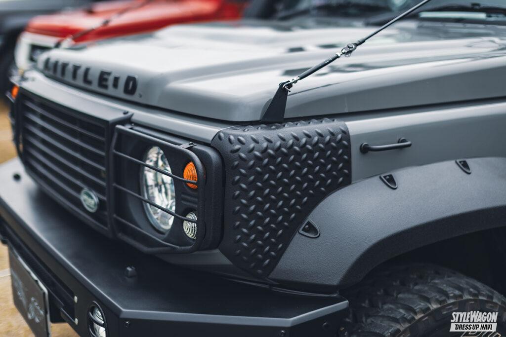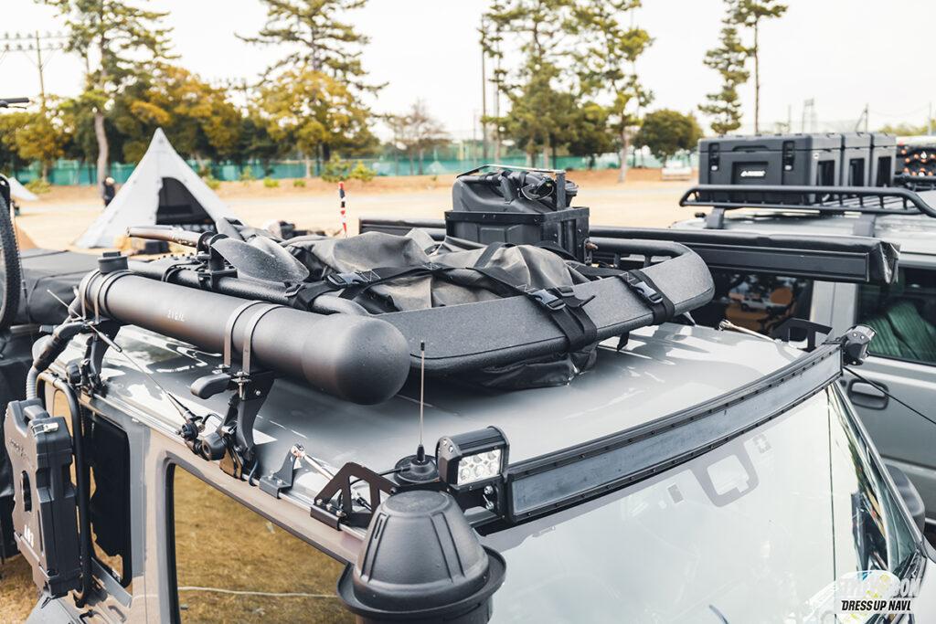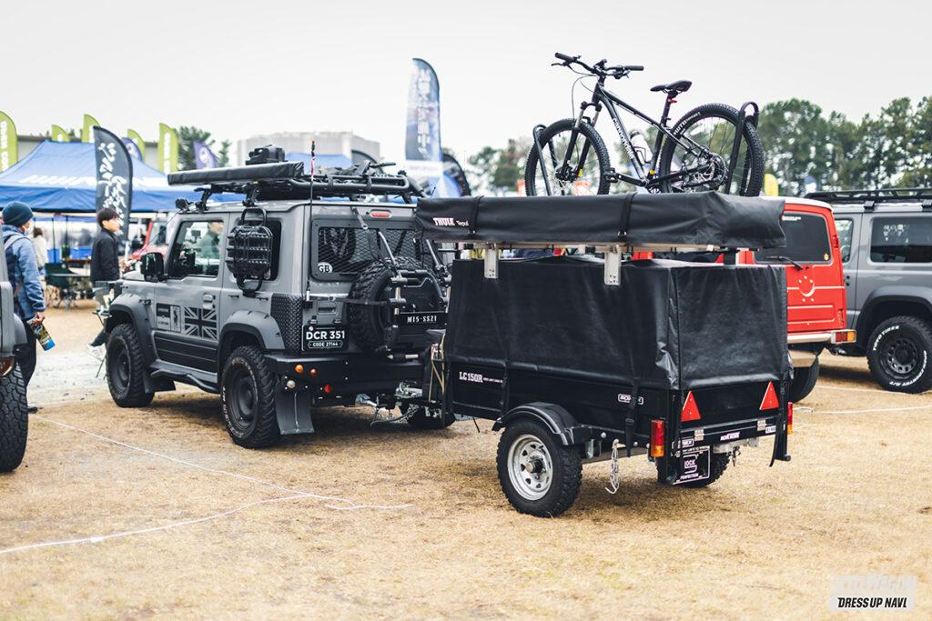 ジムニースタイルコンテストで最優秀賞を獲得したのは、ダムドのリトルD仕様でコンプリートしたノリーさんのシエラ。ただのリトルDではなく、イギリスの特殊部隊車両をイメージしてカスタマイズ。ワンオフで製作したヘッドライトガードや吸盤式で脱着可能なリアウインドウのガードなど、他にはないアイテムでオンリーワンを実現。ヒッチトレーラーも絵になるが、こちらはシエラの車格に合わせてコンパクトなモデルをオリジナルで製作したもの。