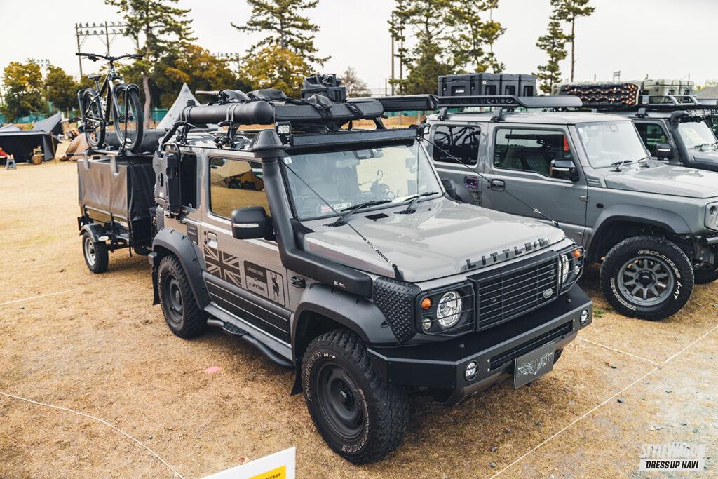 ジムニースタイルコンテストで最優秀賞を獲得したのは、ダムドのリトルD仕様でコンプリートしたノリーさんのシエラ。ただのリトルDではなく、イギリスの特殊部隊車両をイメージしてカスタマイズ。ワンオフで製作したヘッドライトガードや吸盤式で脱着可能なリアウインドウのガードなど、他にはないアイテムでオンリーワンを実現。ヒッチトレーラーも絵になるが、こちらはシエラの車格に合わせてコンパクトなモデルをオリジナルで製作したもの。
