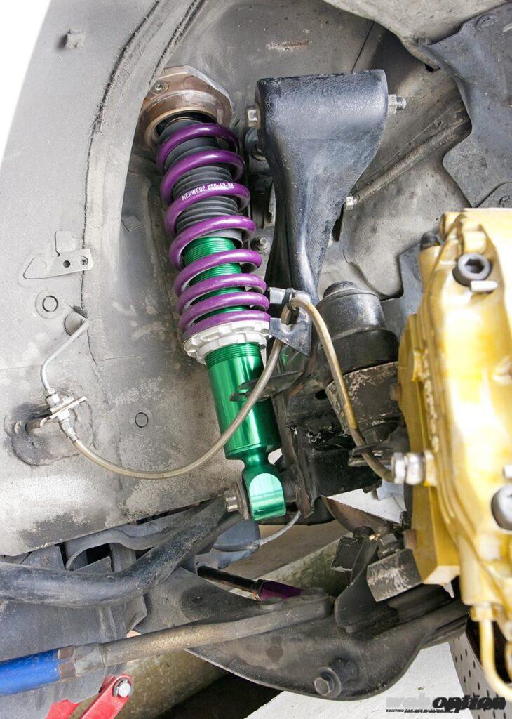 車高調は前後ともテインだが、意外にもケース長はストック状態のままとのこと。ここにも「メーカーさんがお金をかけて一生懸命作った減衰力ですから、簡単に切って縮めたりするのは良くない。だから干渉部分についてはブラケットとか、ボディ側の加工で対処しています」というオーナーの頑固さが感じ取れる。事実、リヤはアッパーマウントを車内側に移設。先端部の逃げを作るため内装カバーを一部カットしている。