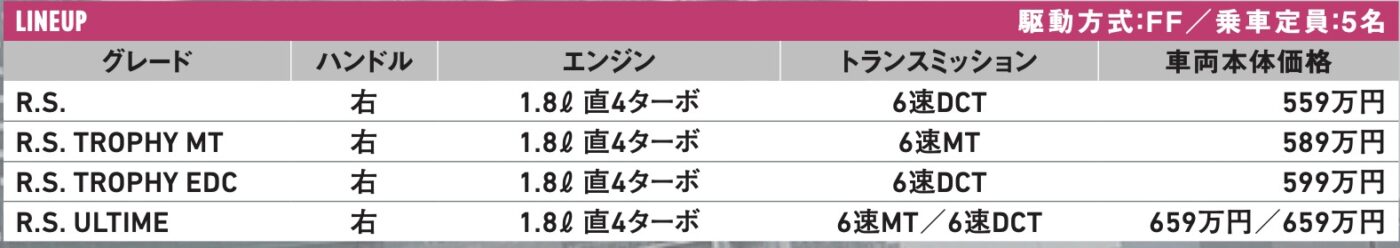 ルノーは直系のスポーツブランド、ルノー・スポールをアルピーヌに集約させることを決めた。これによってこのブランド最後のロードカーになったのが、メガーヌRSとなる。現行型は3代目で、ボディは5ドアのみとなり、直列4気筒ターボエンジンは従来2.0ℓから新世代の1.8ℓに積み替え、トランスミッションは6速MTのほか、同じ6速のデュアルクラッチも選べるようになった。