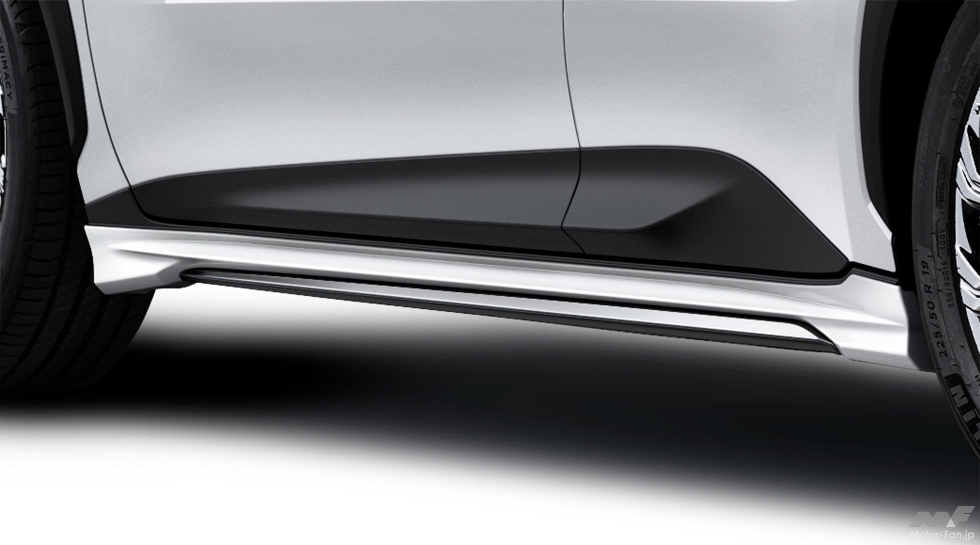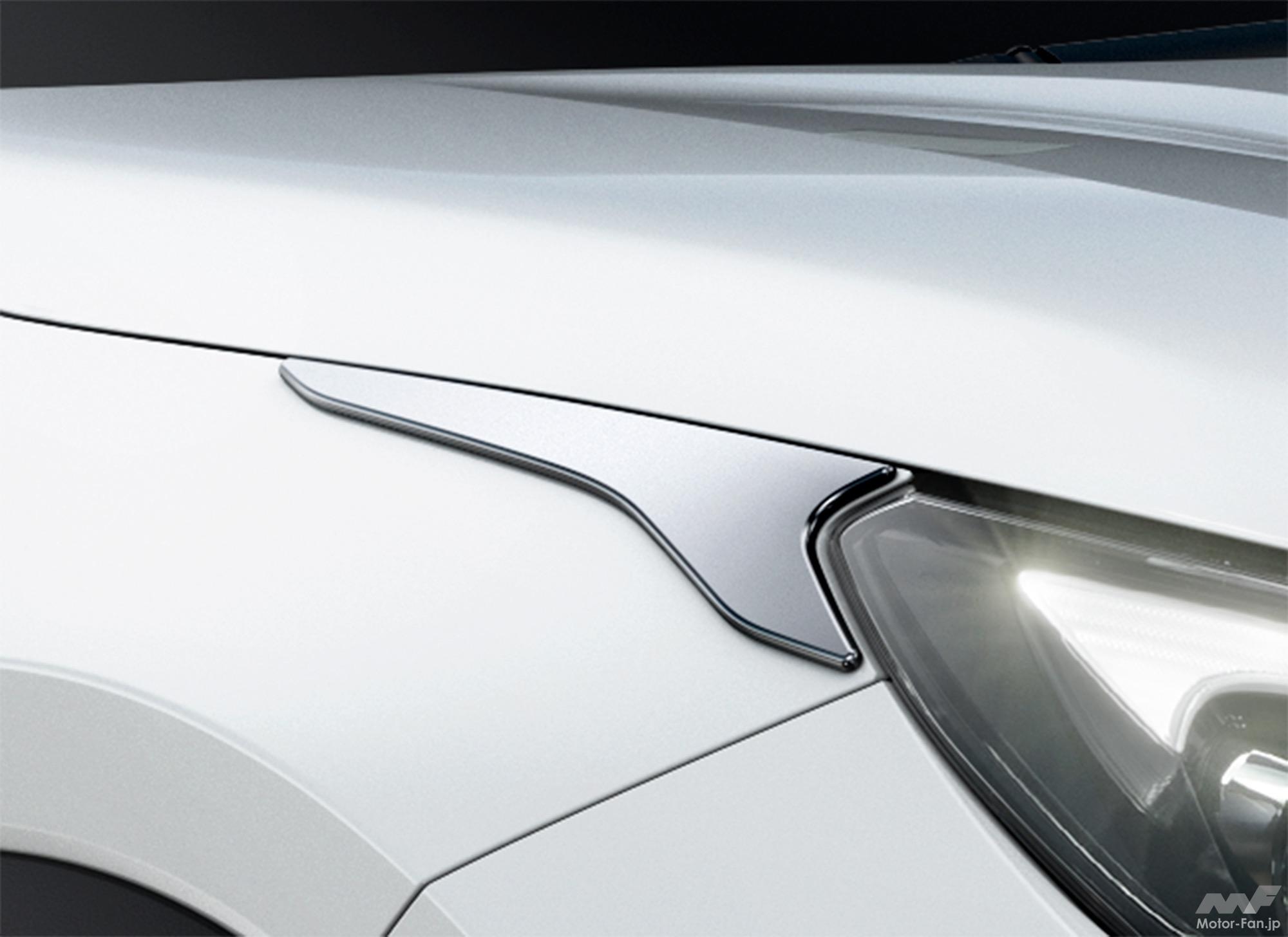 フロントスポイラーは、フローティングさせた金属調のブレード加飾をバンパーと連続した造形で包み込み、ワイドで安定感のあるフロントフェイスを表現。都会と調和する煌びやかで存在感のある表情を演出する。