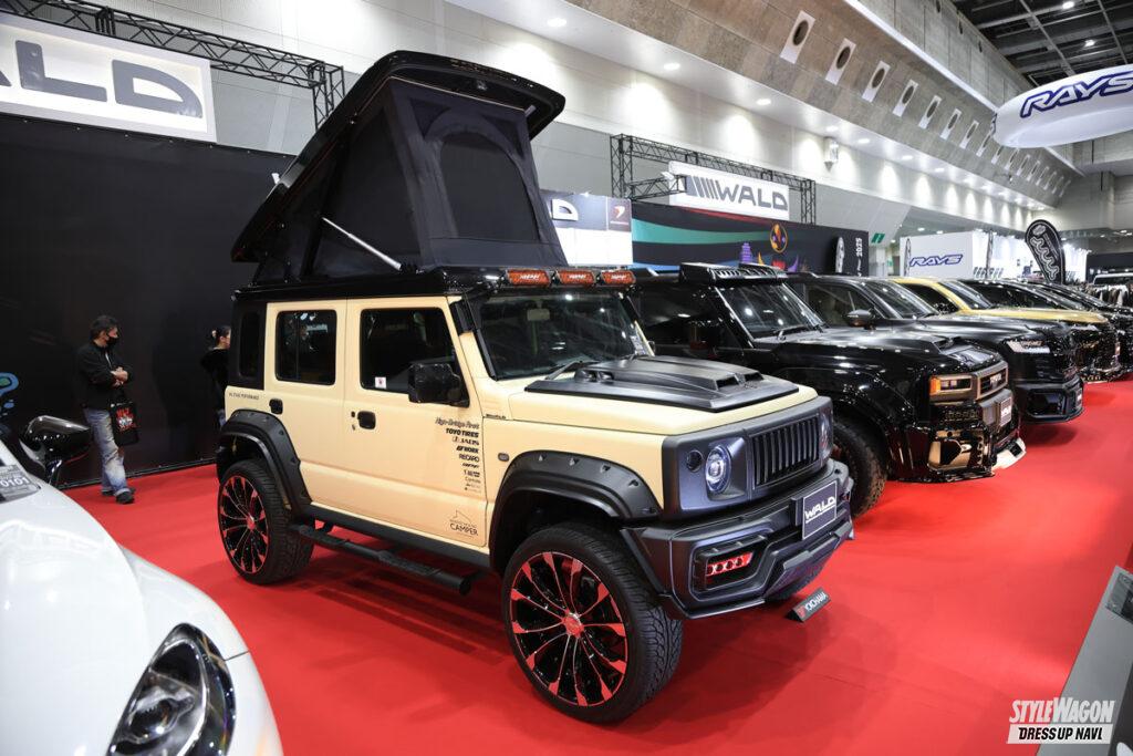 海外仕様ながら、5ドアをベースに速攻でブラックバイソン仕様に生まれ変わらせたヴァルド。前後のバンパーやオーバーフェンダー、ボンネットスクープカバーなど全体から放たれるイカツさに圧倒される。シエラはサイドステップの設定はないが、こちらはパイプタイプのステップを採用。ノマドもこのたくましいスタイルが楽しめるとなったら、ワクワクする人も多いだろう。ちなみにデモカーはルーフトップテントを装備したオーバーランダースタイル。