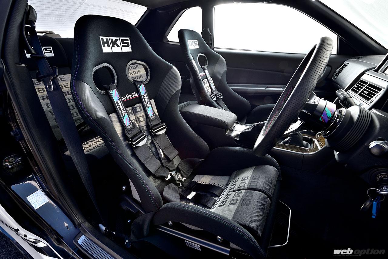 あくまでストリート仕様ということで、エアコンなどの快適装備はそのまま。ロールケージもあえて入れなかったそうだ。ナルディのステアリングやワークスベルのラフィックス(脱着式ボス)、そしてブリッドのバケットシートは全てHKSロゴ&柄入りのコラボモデルに変更。カーボン仕様のセンターコンソールにはEVCのコントローラーをインストールし、ダッシュボードにはシリアルナンバー入りのプレートも装着される。