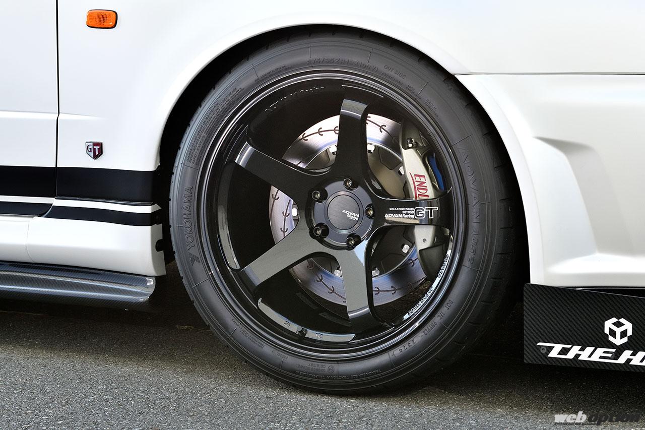 足回りはハイパーマックスRベースのTHE HKSスペックで、ブレーキはエンドレスの最新モノブロックキャリパーを投入。タイヤ&ホイールは、アドバンレーシングGTビヨンドの19インチに275/35サイズのアドバンA052という布陣で、900psに達する大パワーを受け止める。