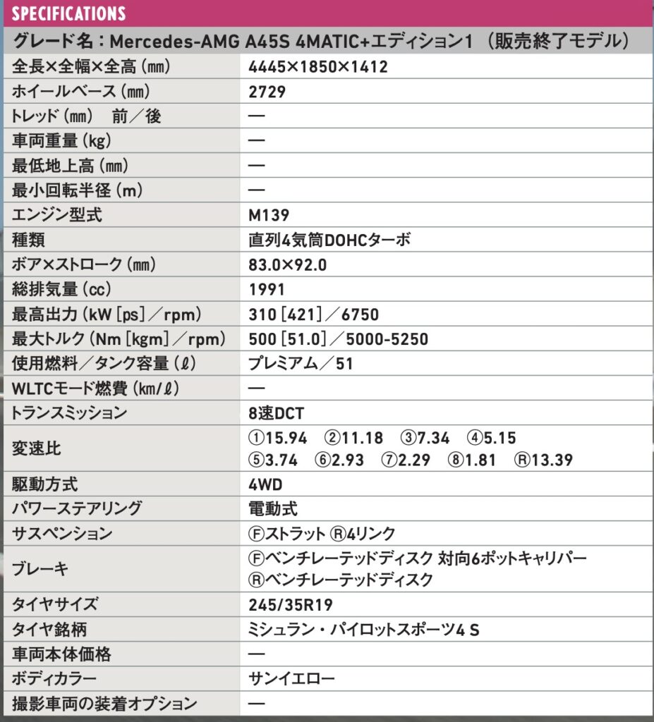 4代目AクラスをベースとしたAMGモデルは2019年にデビュー。従来通りの45シリーズとは別にエントリーモデルの35シリーズも用意された。現在のラインナップはA45S4MATIC+とA354MATICの2種類で、いずれも2.0ℓ直列4気筒ターボだが、前者は421㎰で8速DCT、後者は306㎰で8速DCTとなる。