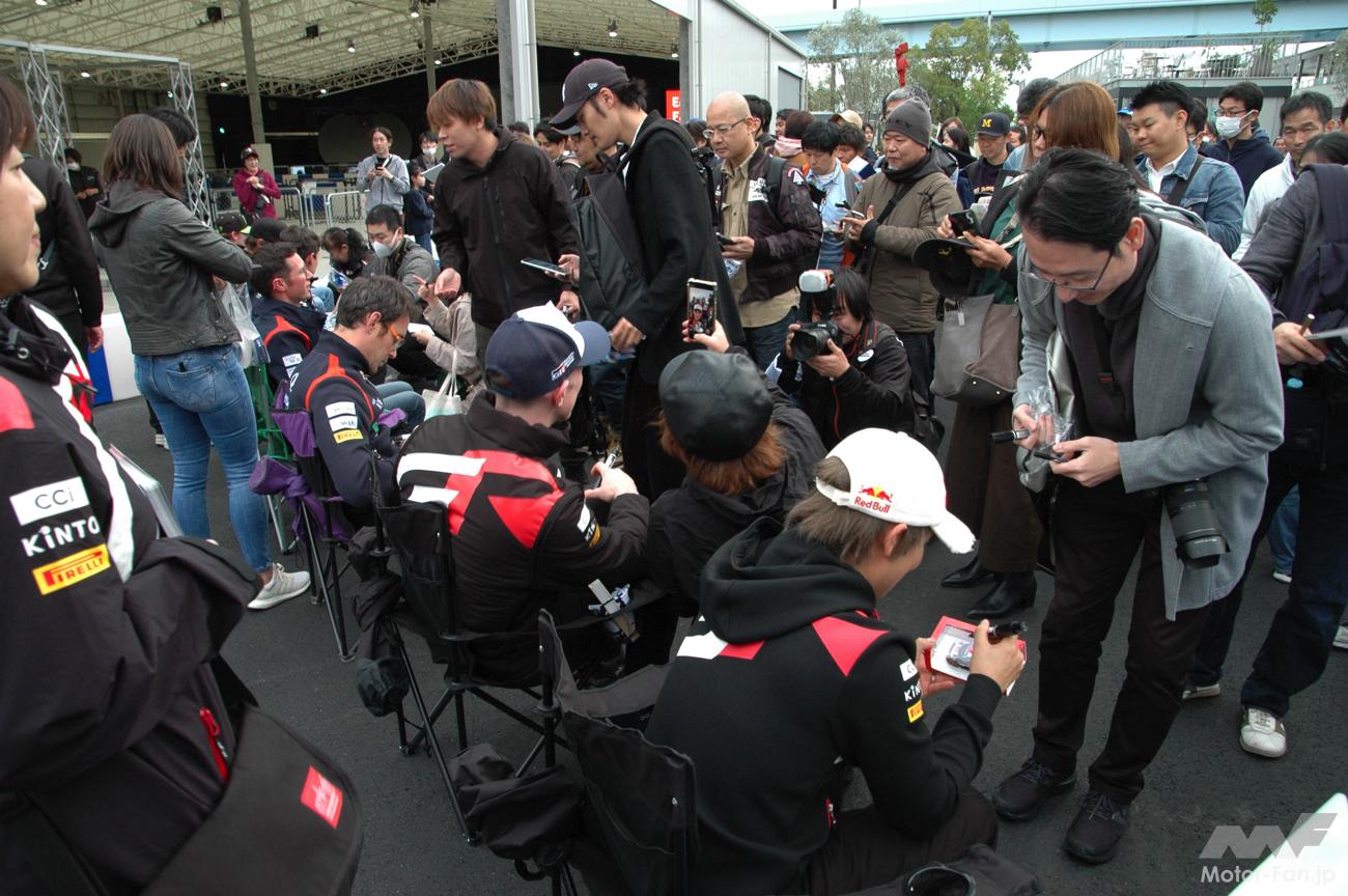 ラリーのスターであるドライバーや母国ラリーとなるトヨタに偏ることなく、ライバルチームであるヒョンデのヌービル選手やフォードのフルモー選手はもちろん、コドライバーのウィダグ選手にも大勢のファンが列を作った。