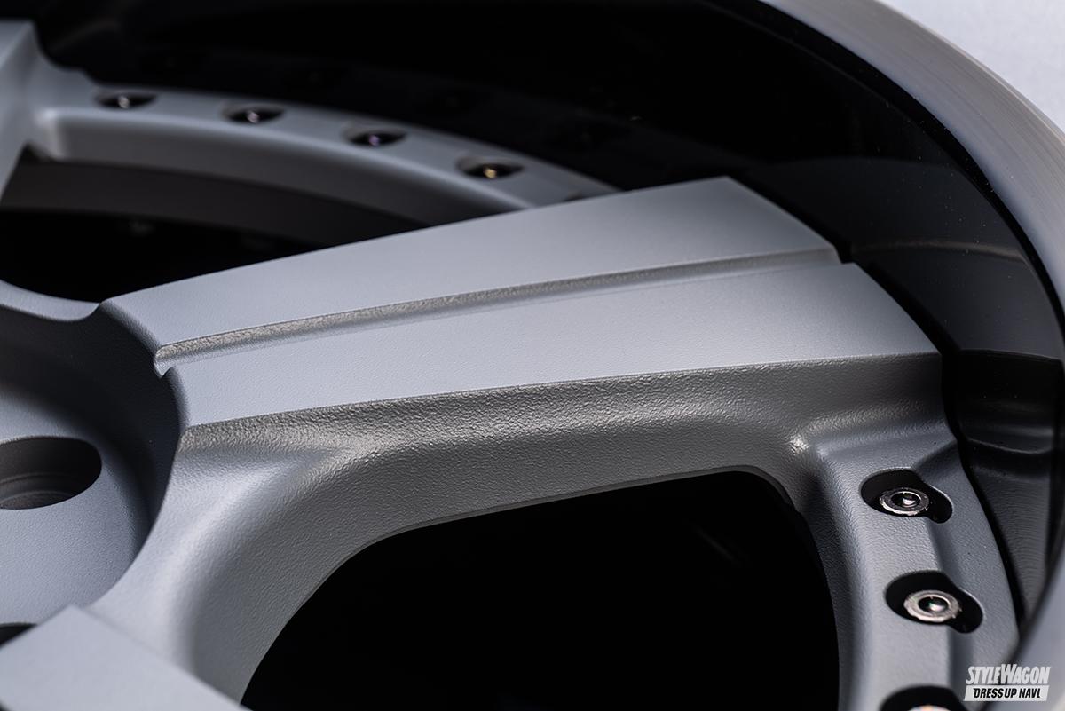 磨き上げることでディスクを上質に輝かせるポリッシュワークへ、熟練の職人が繊細に加える芸術模様。特許庁に意匠登録済みの「スピンポリッシュ」は2020年にレオンハルト・グラウベ専用のカスタマイズセレクションとして用意されたスペシャルフィニッシュだが、惜しまれつつも2024年にグラウベは生産終了となってしまった。そこでスーパースターでは、芸術模様の美しさが余すことなく引き出せるディスクボリュームの備わったレオンハルト・オルデン&ヴァッフェへスピンポリッシュを追加設定。0.01㎜の世界で繊細に加えられていく研磨模様は面を強く主張するディッシュスポークへ見惚れるような立体感を引き出し、足もとに気品あるインパクトを生みだしている。なお、美しさを極めるなら、透き通る陰影で深みが一層強調されていくスピンポリッシュ×カラークリアの重ねワザも見逃せない。ポリッシュ前のベースカラーアレンジまで含めてカスタマイズセレクションのメニューを吟味すれば、スピンポリッシュが放つ立体感の表現力は無限大に広がっていくだろう。