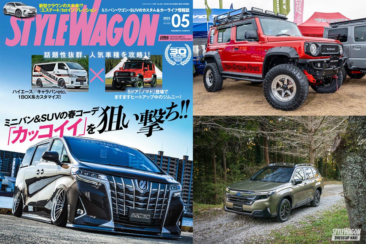 スタイルワゴン5月号の巻頭特集では、2025年に入り東京オートサロンなどで続々と発表されたカスタムパーツを使って、カッコイイ愛車に仕上げられるネタを凝縮。基本となる足元をきめるホイール、エアロなどのボディパーツ、コスパの良いコンパクトカー&Kカーのコーディネイトを多種多様で紹介中。もちろん、この4月に話題となった新型クラウンの大トリを飾る「クラウンエステート」、スバルの人気SUV「フォレスター」のフルモデルチェンジと、注目の新型車を徹底解説。また、すでに受注停止という人気を誇る「ノマド」の登場でますます人気が加速している「ジムニー」のカスタムシーンをレポート。そして、アウトドアシーンでも活躍中のハイエースなどの1BOXの最新スタイルも特集。今月号もボリューム満載で、いま旬の愛車カスタマイズをお届け!