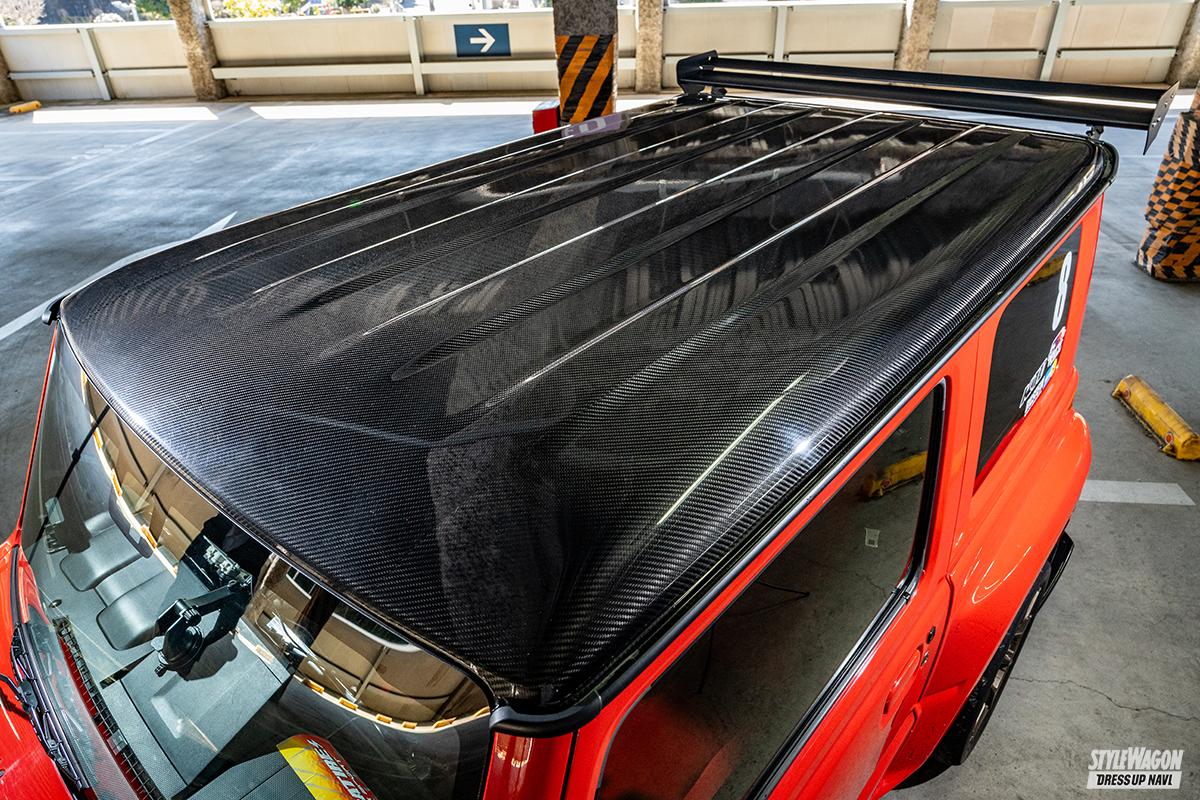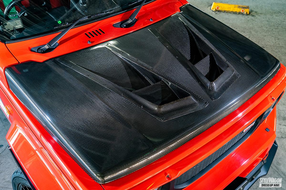 外装に目を向ければ、カナード&ディフューザーに大幅な軽量化を実現するカーボンボンネットとカーボンルーフ。さらにボディはダムドのオーバーフェンダーで広げた上で注目必至の17インチオリジナルホイールを履きこなす