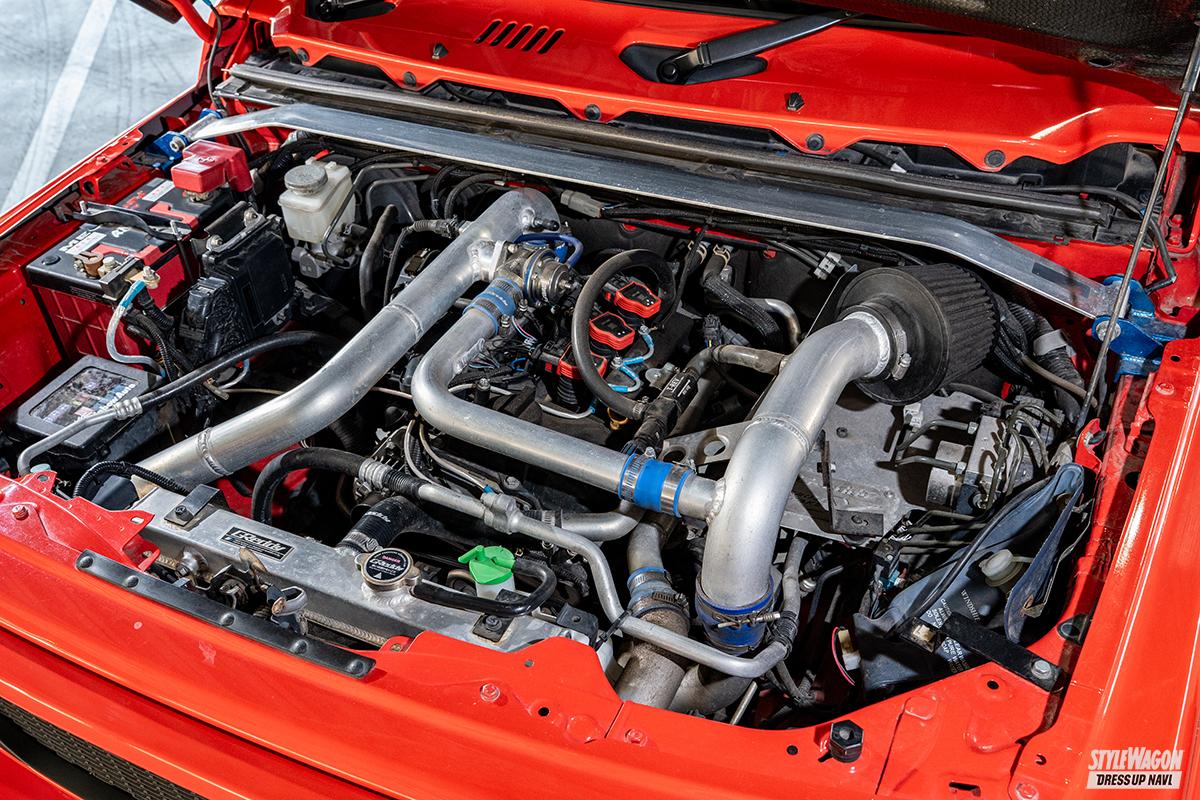 チューニングメニューに目を向ければ、それも納得するだろう。まずエンジンはトラスト製のインタークーラーをベースにパイピングをオリジナルでワンオフ加工し、タービンはオリジナルのハイフロータービンに交換。さらにエンジン本体も燃焼室の加工を施し、ポート研磨とヘッドガスケットを強化タイプに換装している。もちろんコンピューターも手を加え、自社のシャシー台では110馬力、純正換算で130馬力もの出力を誇るモンスタージムニーを生み出した。また、足まわりはオリジナルのコイルスプリングとビルシュタインショックで固め、ほどほどにローダウン。下げるだけならもっと落とすことも可能だが、そこは走行性能を重視したセッティングで煮詰めているという。その上で、サーキットを走るなら四駆機能はいらないと完全FR化(横尾さんがジムニーの純正機能で付いている4速低速を使ったのは新車で届いた時ぐらいだというから驚き)。トランスファーまで交換して軽量化を図っている。