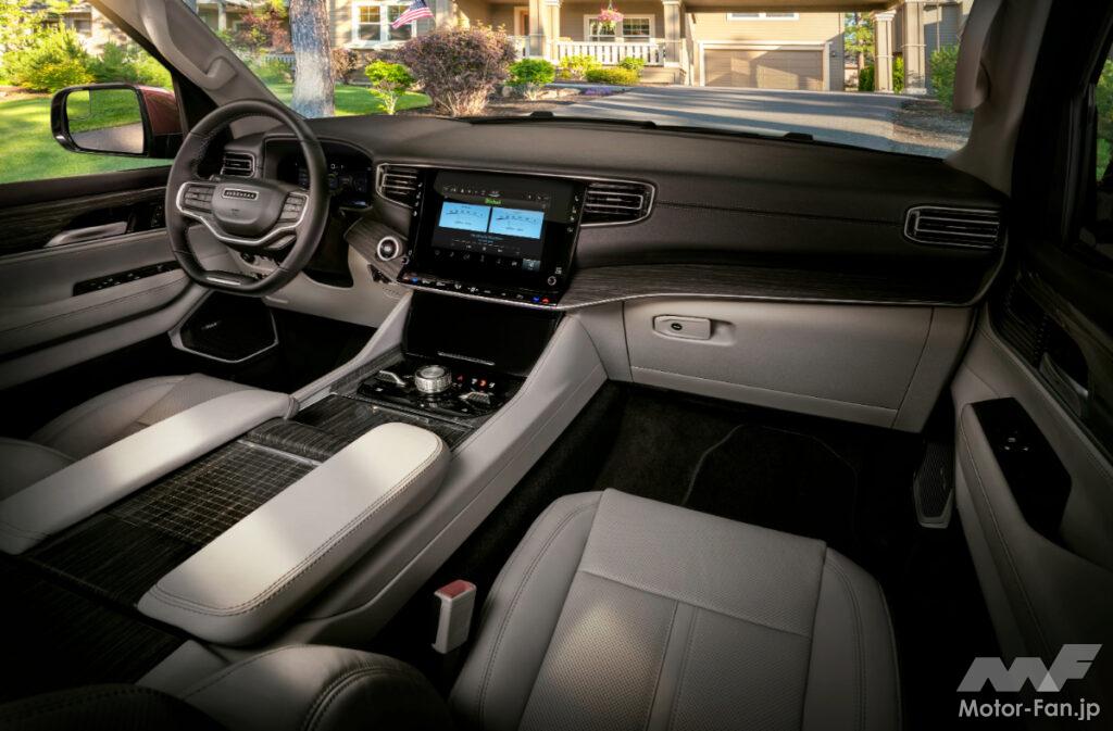 クラフトマンシップがいかんなく発揮されている新型『ワゴニア』のインテリアは、洗練されたエレガントさを醸し出し、最大8人乗りの広々とした3列シート、クラス最高の総乗員数、クラス最高の2列目および3列目レッグルーム、3列目後方で最大の荷室容量を誇っている。
