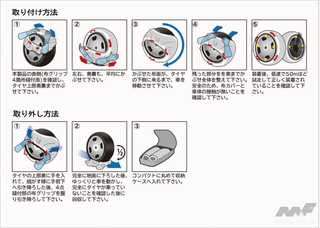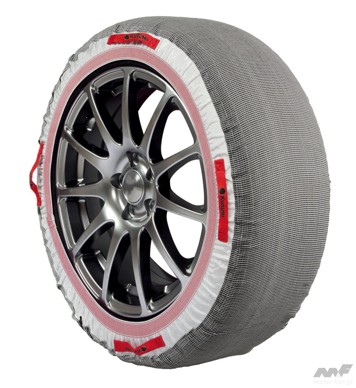 ニューレイトンの『アイスバーン ウインターソックス KURUMI』は“ソックスタイプ”と呼ばれている布製のタイヤチェーンで、タイヤに被せるだけの手軽な取り付けが魅力。装着の際には車両移動は必要になるがジャッキアップは不要だ。腕カバー&作業用手袋、膝置きとしても使える収納ケースが付属する。