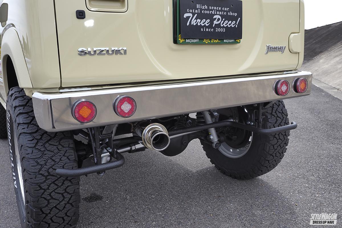 アイボリーのJB64が、可愛くカスタムされているスリーピースの取材車両。これ、お客様のオーダー車両で、ちょうど納車直前とのこと。コンプリート販売をしているの? という疑問に、担当してくださった原さん曰く、「うちでは、決まったコンプリートというのはないんです。購入してカスタムを同時に行うお客様と相談して、様々なカスタムを行って行くスタイルです」とのこと。今回の車両をよく見ると、エクステリアから、インテリア、サスペンション、スープアップなど、ほぼ全ての部分に手が入っている。ここまでの話を聞くと、普通のショップのような気がするが、スリーピースのウリは、技術力の高さ。スリーピースは、ジムニーの専門店ではない。言うなればカスタムの専門店なのだ。一つ一つの仕上がりに対してのこだわりが凄く、とにかく美しい。これらのノウハウは、乗用車系のローダウンカスタムを長年やってきたからこそ。