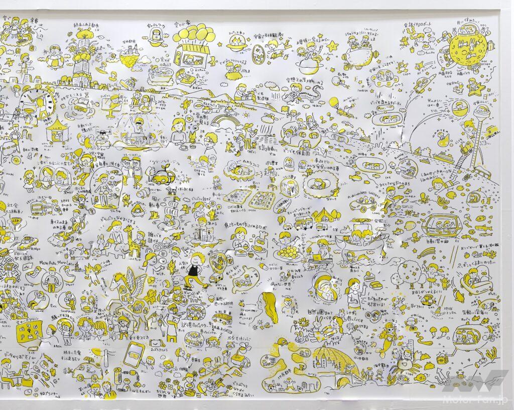 西館には壁一面にイラストが描かれたコーナーが設けられた。これは来場者にどんな未来を感じたかを文章で書き、それをイラストレーターがイラスト化するといったちょっと変わった企画だ。とても興味深いので、すべのイラストが見えるサイズに分割して掲載する。拡大して見てください。
