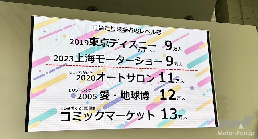 ちなみに、今年の上海モーターショーは会期10日間で90万6000人の入場者だった(9万0600人/日)。し