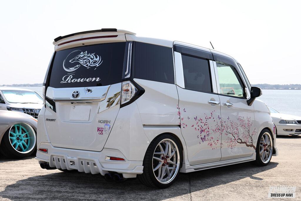 ドレスアップの世界では決して主役の車種ではないが、だからこそカッコ良く決めているとひときわ目立つ。このルーミーもそんな1台だ。ロェンのエアロに車高調によるローダウンというシンプルなまとめ方だが、ボディサイドには桜のグラフィックが! さらにドアミラー部にも桜をあしらった(ボディサイドはステッカー、ミラー部は塗装と仕上げは異なる)。このクルマ、奥様が普段使うクルマだけど、イジる時はご主人が主役。当然、勝手にはイジッていないそうです、ご安心を!?