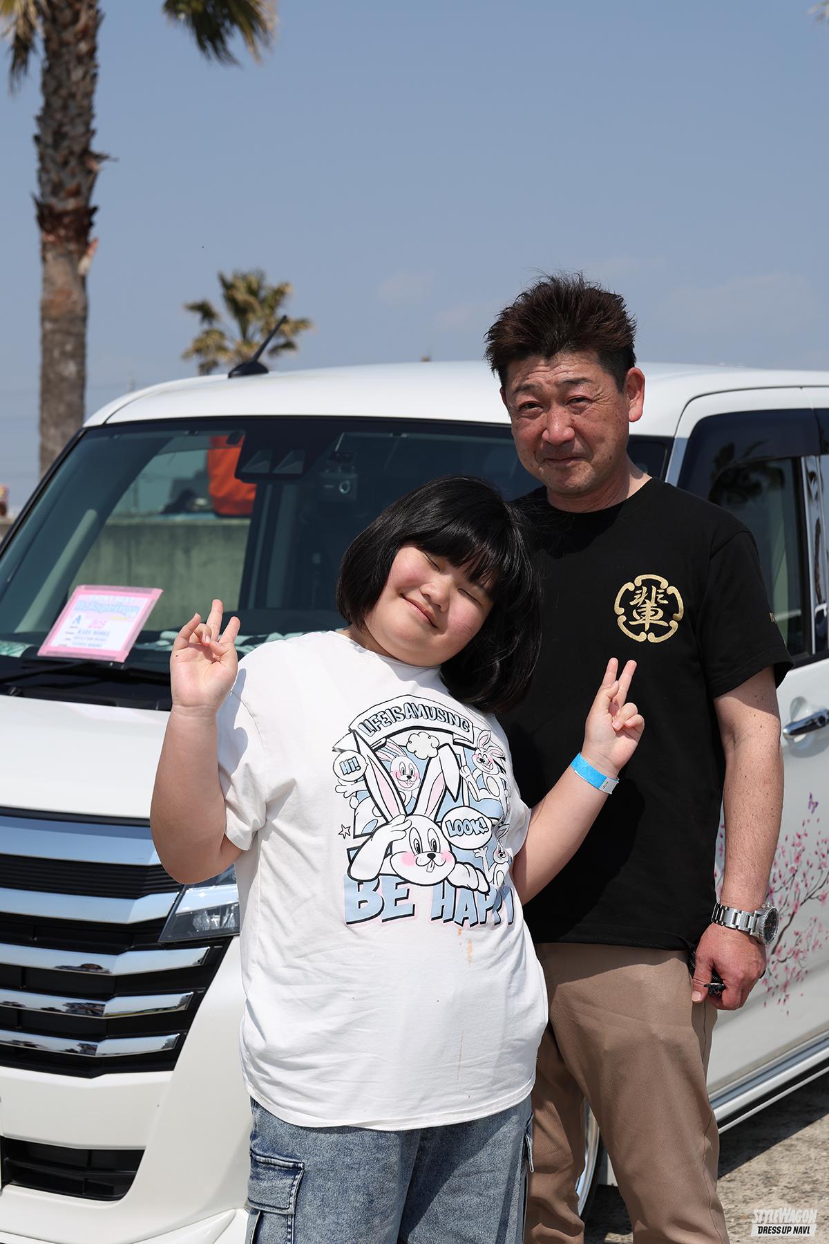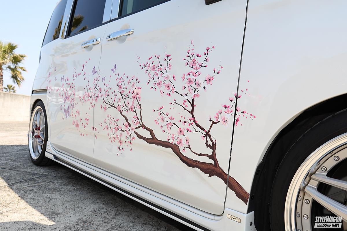 ドレスアップの世界では決して主役の車種ではないが、だからこそカッコ良く決めているとひときわ目立つ。このルーミーもそんな1台だ。ロェンのエアロに車高調によるローダウンというシンプルなまとめ方だが、ボディサイドには桜のグラフィックが! さらにドアミラー部にも桜をあしらった(ボディサイドはステッカー、ミラー部は塗装と仕上げは異なる)。このクルマ、奥様が普段使うクルマだけど、イジる時はご主人が主役。当然、勝手にはイジッていないそうです、ご安心を!?