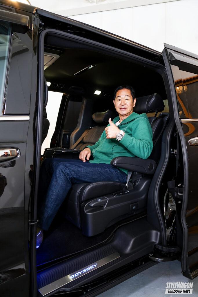 「このオデッセイは基本普段の足として乗っていて、仕事の時は後部座席に乗ることがほとんど。もちろんショーファーカーとしては、やっぱりアルファード&ヴェルファイアが人気だと思うんだけど、オデッセイは低床で乗降がすごい楽っていうのがポイント。今回のマイチェンで後部座席の質感とか乗り心地もすごく良くなったからアルヴェルにも劣らないと思う。もちろんたまに自分で運転して遊びに行くんだけど、その時のドライブフィールがとてもスポーティで好き。ボディもフルサイズミニバンに比べるとひと回りコンパクトでちょうどいい感じの大きさで運転しやすい。ハンドリングもすごく良くてそこら辺はホンダらしさが出ている。アルヴェルばっかり人気だけど、もっとオデッセイも増えていいと思うんだよね」と、土屋さん。