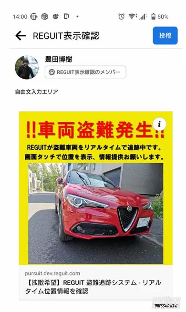 「最近本当に多いのがSNSのDMで、クルマを盗まれたので情報を拡散してください!っていうやつ。クルマ好きとしてその気持ちがすごくわかるので、できるだけ対応してるんだけど、どうしてもおっつかない場合があって。なんとかしたいなって思ってるときにこのリグートの話を聞いてすごく興味があったんだよね」と土屋さん。