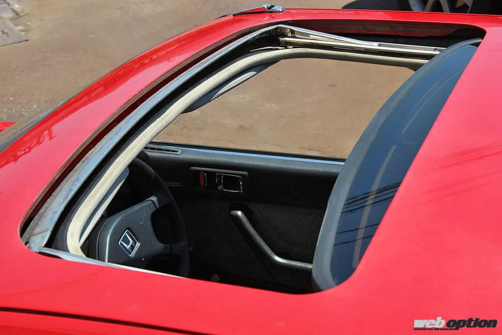 純正オプションの電動ガラスサンルーフ。内側には直射日光を遮るためのシェードも設けられる。ちゃんと作動するのは見事だが、年式を考えると雨漏りが心配だったりするのも事実。