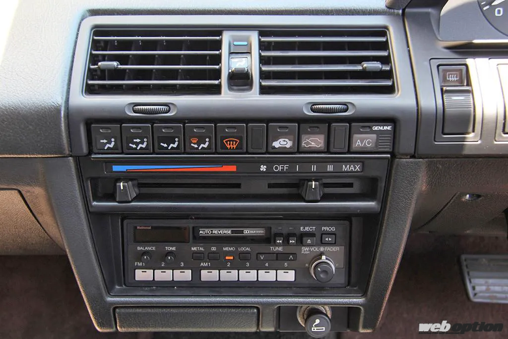 マニュアルエアコンの操作パネルと、純正カセットデッキ一体型AM/FM電子チューナーラジオが上下に並ぶセンターコンソール。