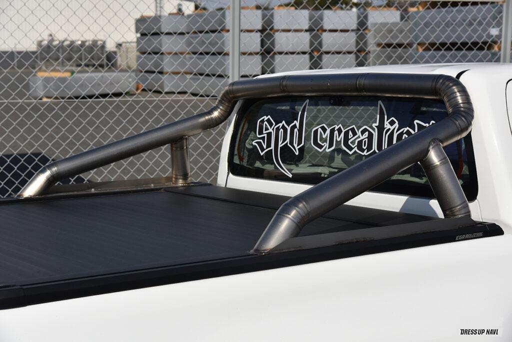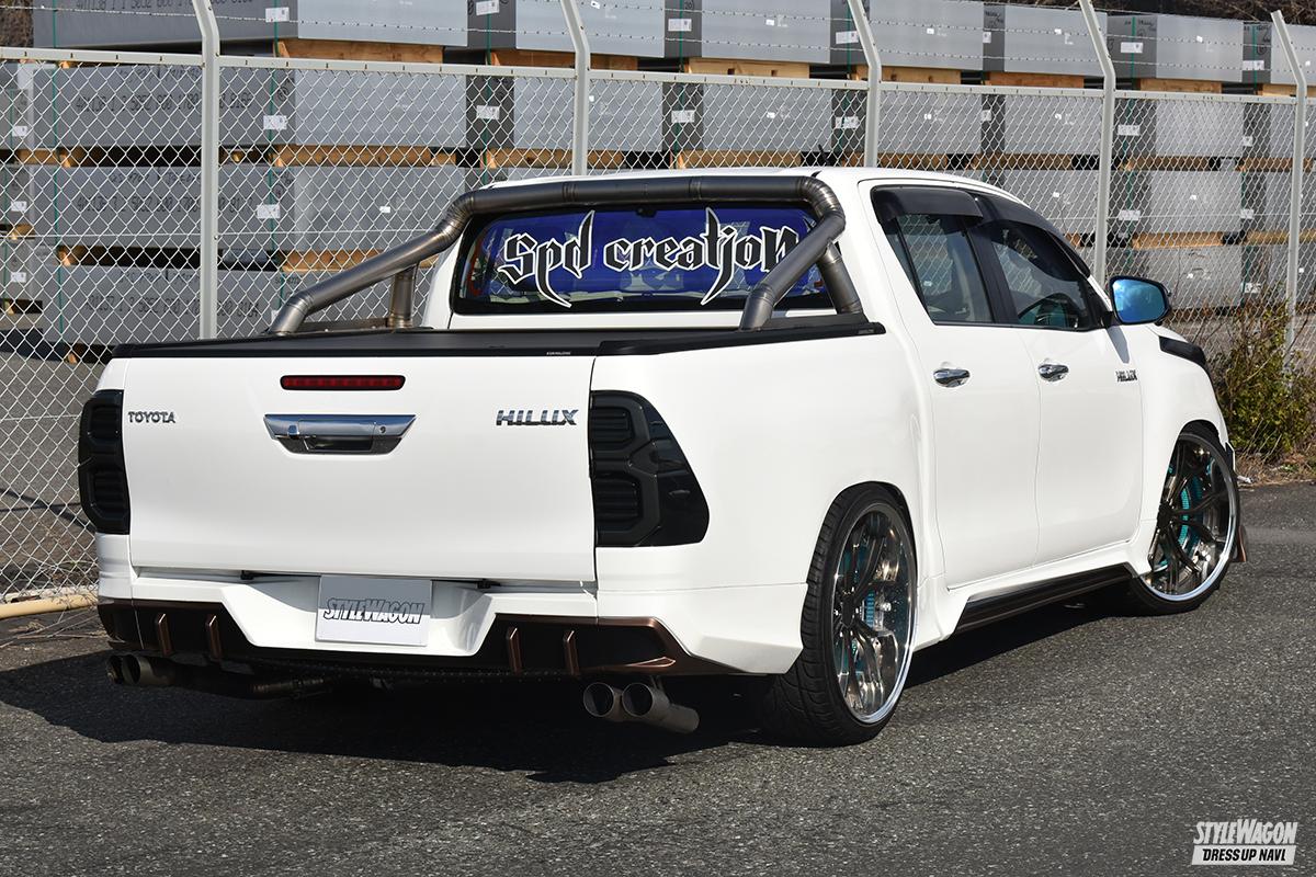 SPDクリエーションはハイラックの造詣が深く、アゲは当然、サゲにも強い。なかでも必見はご覧のサゲ。デモカーは、底まわりの3点エアロを軸とした、ハイラックスでは珍しいエアロボディが際立つ1台だが、見所は足にもあり、なんとエアサスもオリジナル。適時上げ下げできる機動性の高さはいうまでもなく、エアを抜けばフロントで9インチ、リアで12インチも落ちる驚異のパフォーマンスは、1度手にしたら最後もう戻れない!!