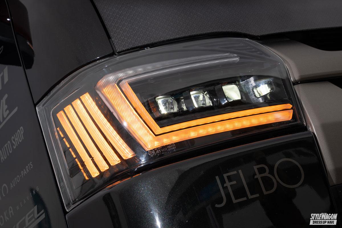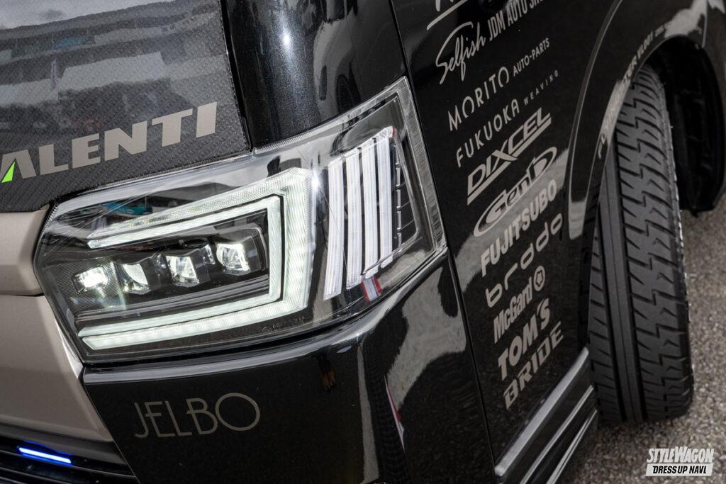 ブース前に展示されたハイエースのトピックは、東京オートサロン2024で発表された「ジュエルヘッドランプULTRA」。同イベントではプロトモデルとしての発表だったが、4月末発売予定の製品モデルを装着してのディスプレイとなり、高輝度LEDを採用する「ジュエルヘッドランプULTRA」の存在感は日中でも注目の的だった。そんな同製品最大の特徴となるのが、200系ハイエースのアフターパーツとしては初となるコーナリングランプの採用だ。レンズ中央にレイアウトされる3眼LEDプロジェクターランプ内側に設置されたのがコーナリングランプで、ウインカー連動、もしくはステアリングの舵角に反応して、ヘッドライトでは照らしきれない広範囲を照らしてくれる。最大4眼(!?)となる目力のアピール力だけでなく、実用面においても高い効果を発揮してくれる。また、コの字型に点灯するポジションライトはウインカーランプとしての役割も担い、配線の接続方法によってシーケンシャル仕様で点灯させることも可能だ。他にも欧州車などに搭載されているオープニン&エンディング機能を搭載しており、ドアロック&アンロック時に、ヘッドランプがモーション点灯する機能も持ち合わせている。すでにハイエース専用のカスタムヘッドランプは様々なメーカーから発売されているが、ここまで多機能なモデルはヴァレンティだけ!!