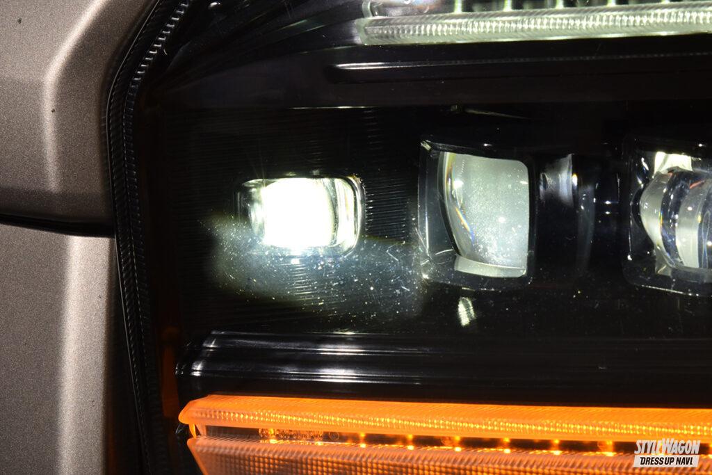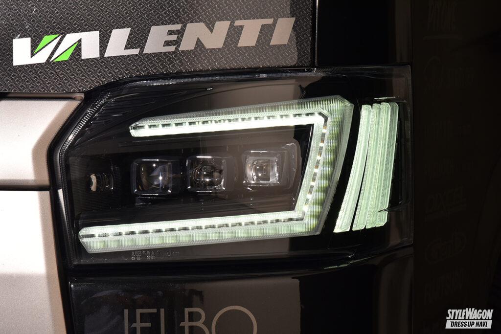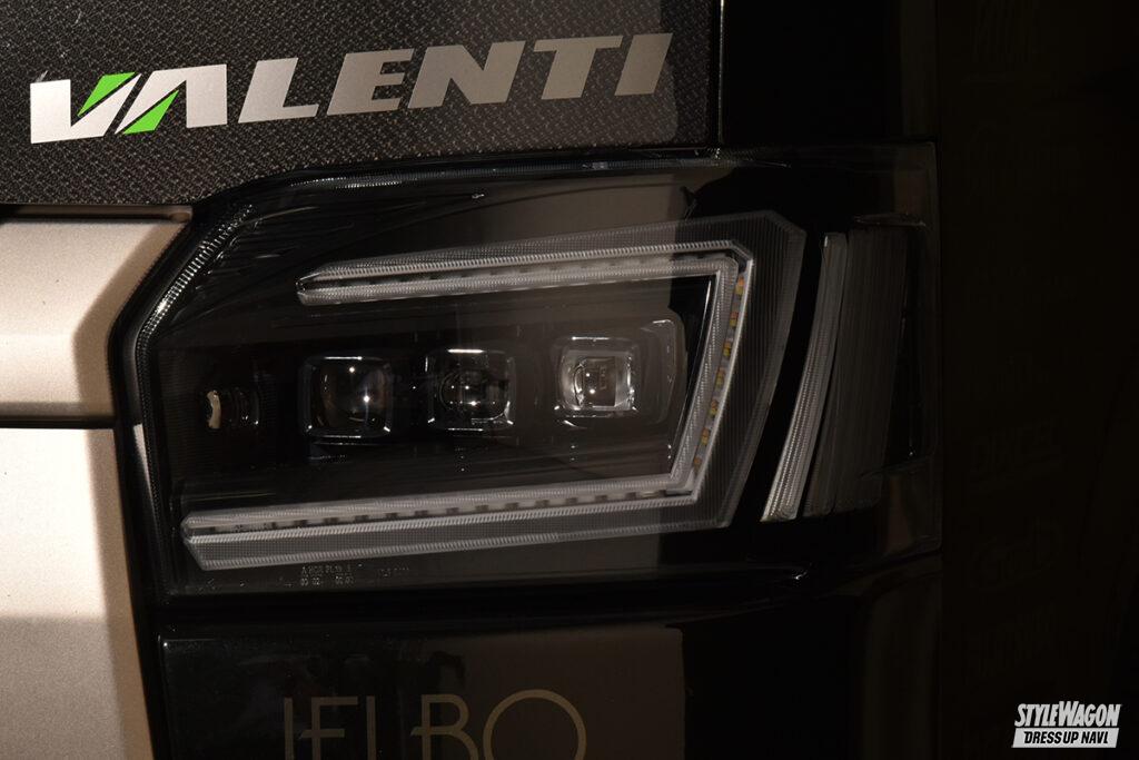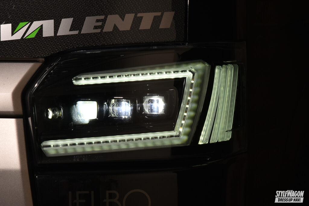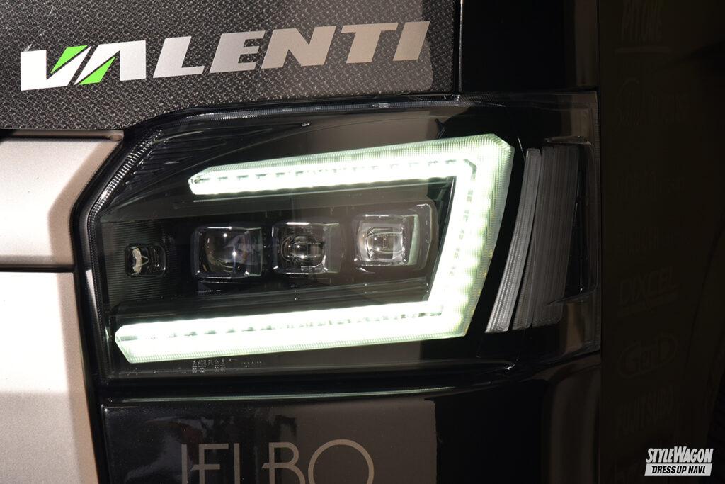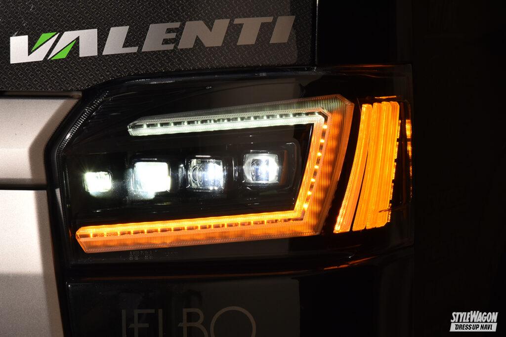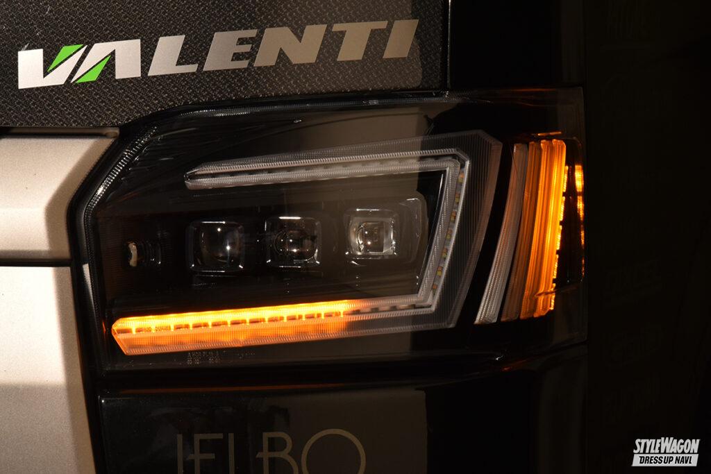テールランプだけでなく、ハイエース用ヘッドライトのラインアップも非常に豊富なヴァレンティ。間もなく発売予定のジュエルヘッドランプウルトラもなかなか強烈。まずロー&ハイビームは片側3連プロジェクターを搭載。光源はもちろん最旬のLEDだから視認性は文句なし。プロジェクターを縁取るコの字型のデザインには様々な機能を凝縮。イグニッションオンと同時にデイライトとして発光し、スモール作動時に減光して光るポジションランプ機能も両立。そしてウインカー作動時にはコの字の一部が両端のバーと共に点滅する。シーケンシャル機能を選べば内側から広範囲に渡って光が流れて注目度が増す。そしてウインカーポジション機能をONにすれば、両端のバーもデイライト&スモール連動で点灯する(保安基準適合外)。
