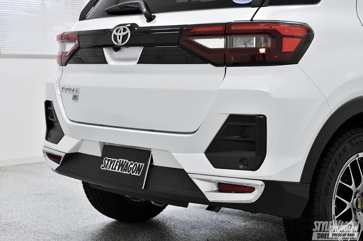 フロントはライズに元来備えられているフロントグリルをmodel LMが拡張するイメージ。もともとある格子状デザインを取り入れたガーニッシュと両サイドのメッキフレームに加え、LEDを搭載したバンパーガーニッシュを装備。