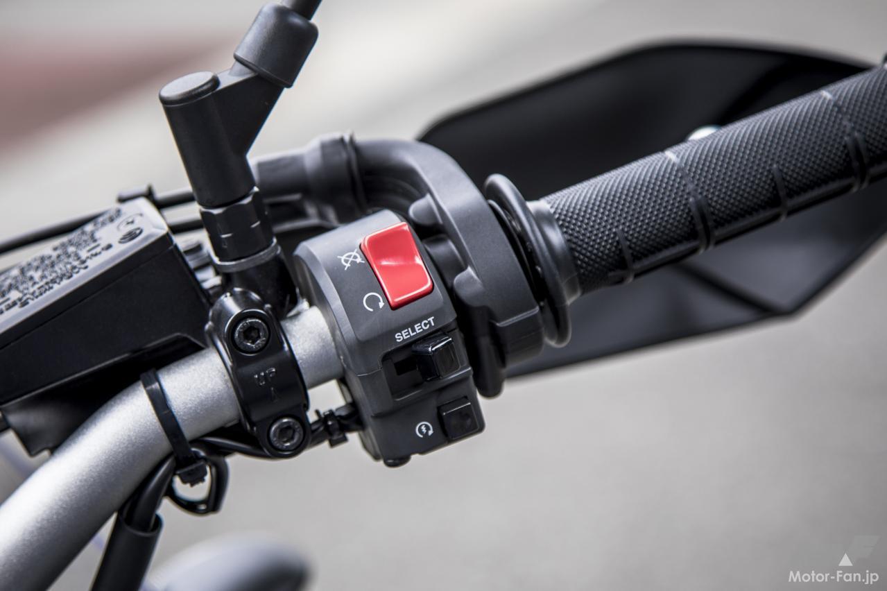 ハンドル幅は意外と広くない。ライディングポジションは背筋を伸ばした自然体にピタリと快適に決まる。前方の見晴らしが良く、なおかつコンパクトに仕上げられたスクリーン等のデザインも奏功して周囲の路面状況も良く見えるのが気に入った。