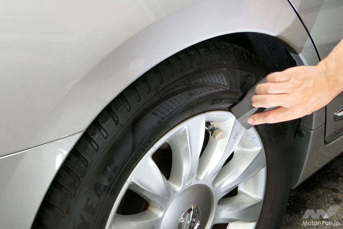 タイヤを洗って汚れを落とし水分を拭き取ったら専用スポンジに液剤を取り、タイヤ側面に均一塗り込むだけ。