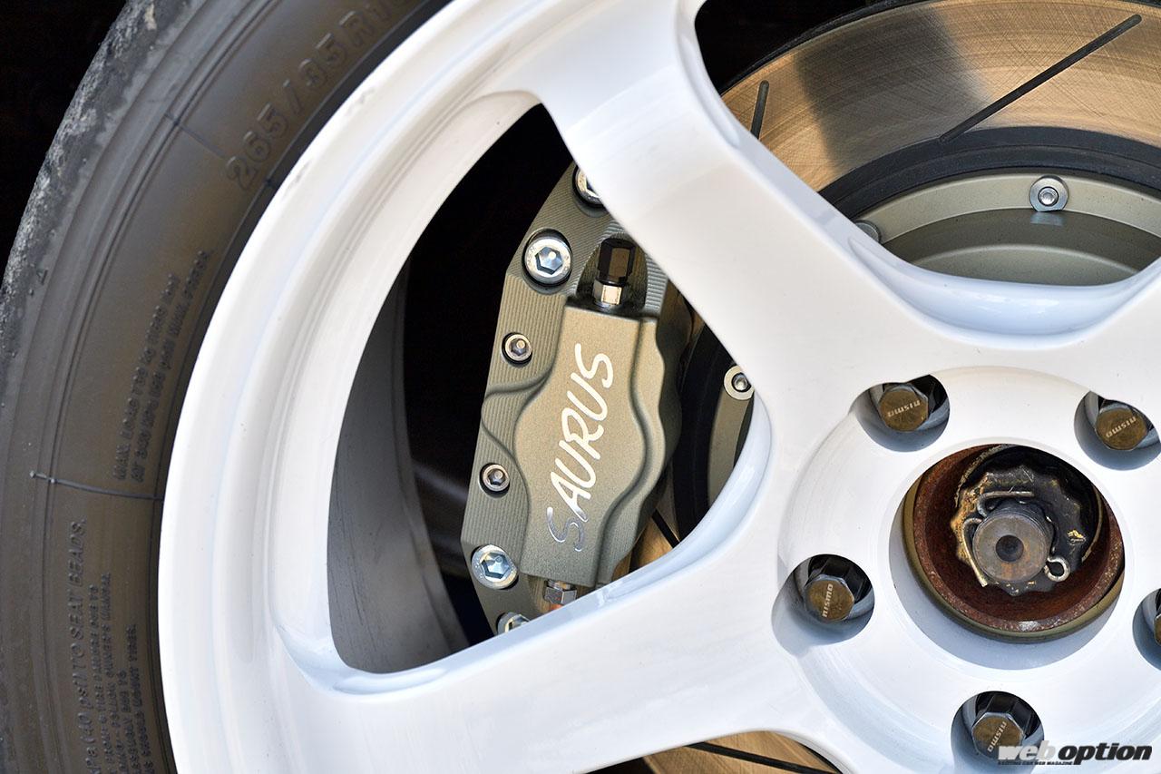 ブレーキは、ザウルスオリジナルのフロント6ポット&355mmローター、リヤ2ポット&325mmローターという構成。R35GT-Rの純正ブレーキキットを移植する第二世代GT-Rは多いが、「車重の軽い第二世代GT-Rに装着すると、バランスが悪くリヤが効きすぎてコーナーでブレーキが踏めないんだよね」と林さん。取材車両は、ブレーキマスターシリンダーの大容量化も行われていた。