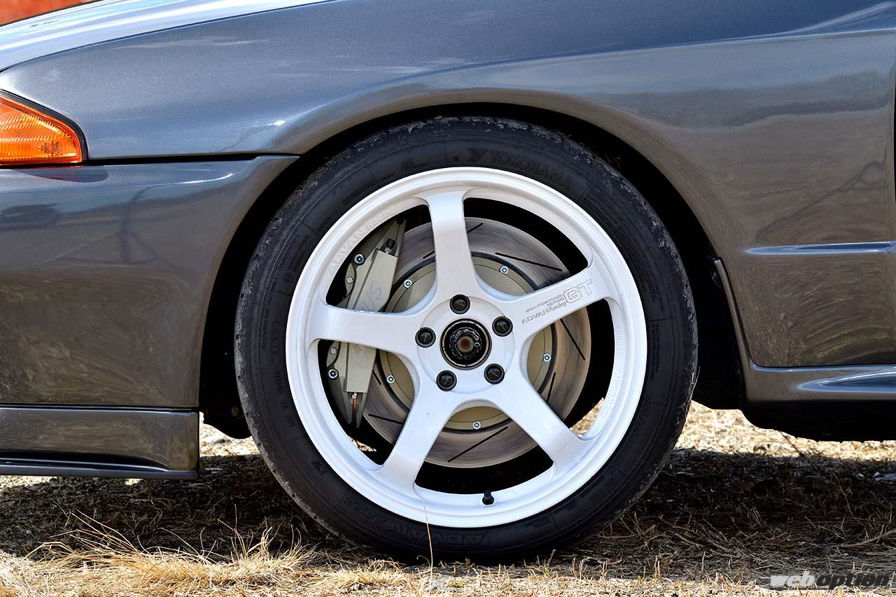 足回りはオーリンズのDFV(F9kg/mm R7kg/mm)を軸にセットアップ。ホイールは10.5Jプラス15×18インチのアドバンレーシングGT-Rビヨンドをセレクト。フェンダーはフロントにFRP製の社外品、リヤは叩き出しで前後ともに片側15mmずつのワイド化が図られている。