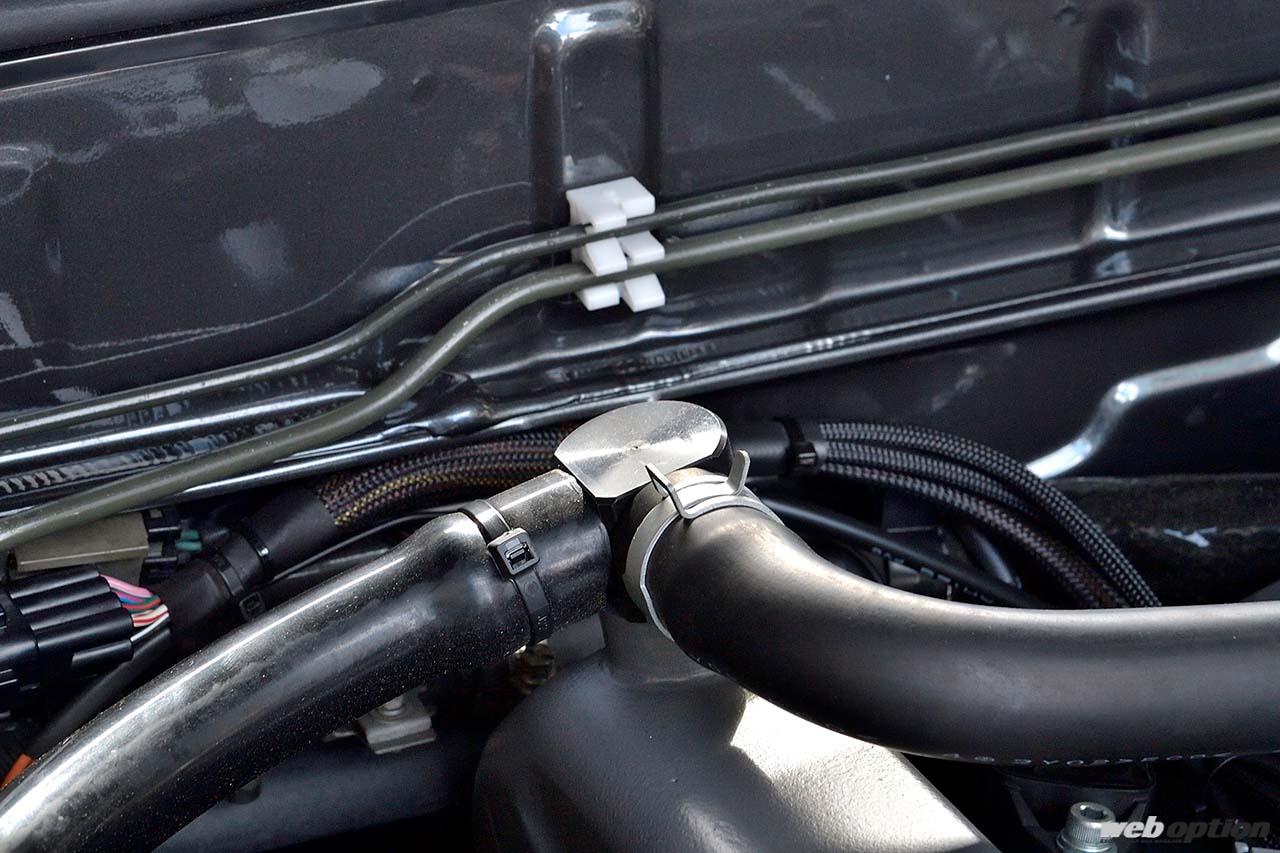 この車両は、元々インタークーラーパイピングを通すための穴がエンジンルームに開けられていたため、高出力化に最適なハイパーチューンのサージタンクをセット。ちなみに、ボディをカットしたくないユーザーには、ニスモのサージタンクを使用するケースが多いそうだ。
