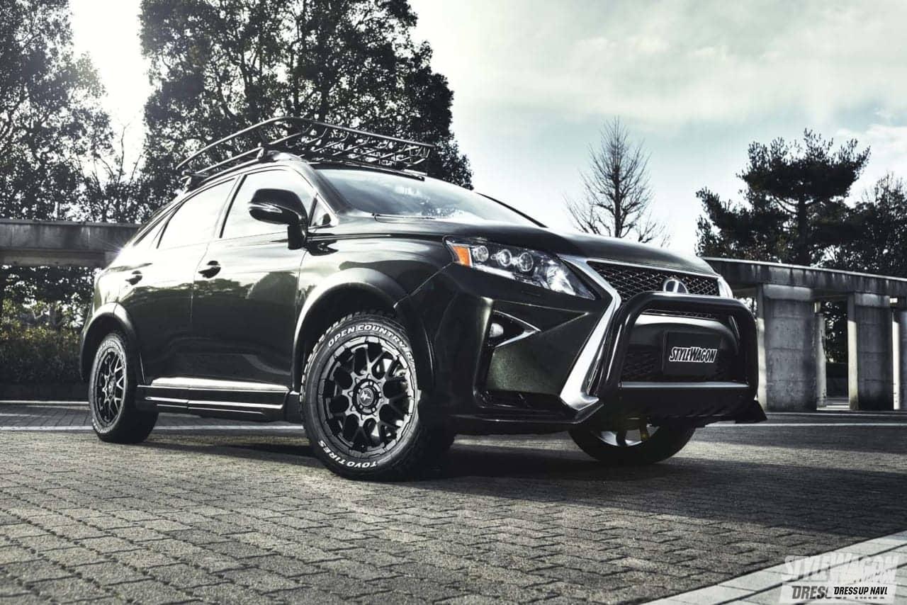撮影車は、レクサスに特化したエアロラインアップで知られるファルコナーのRXだが、ご覧の通りオフ系スタイルとの相性は抜群だ。