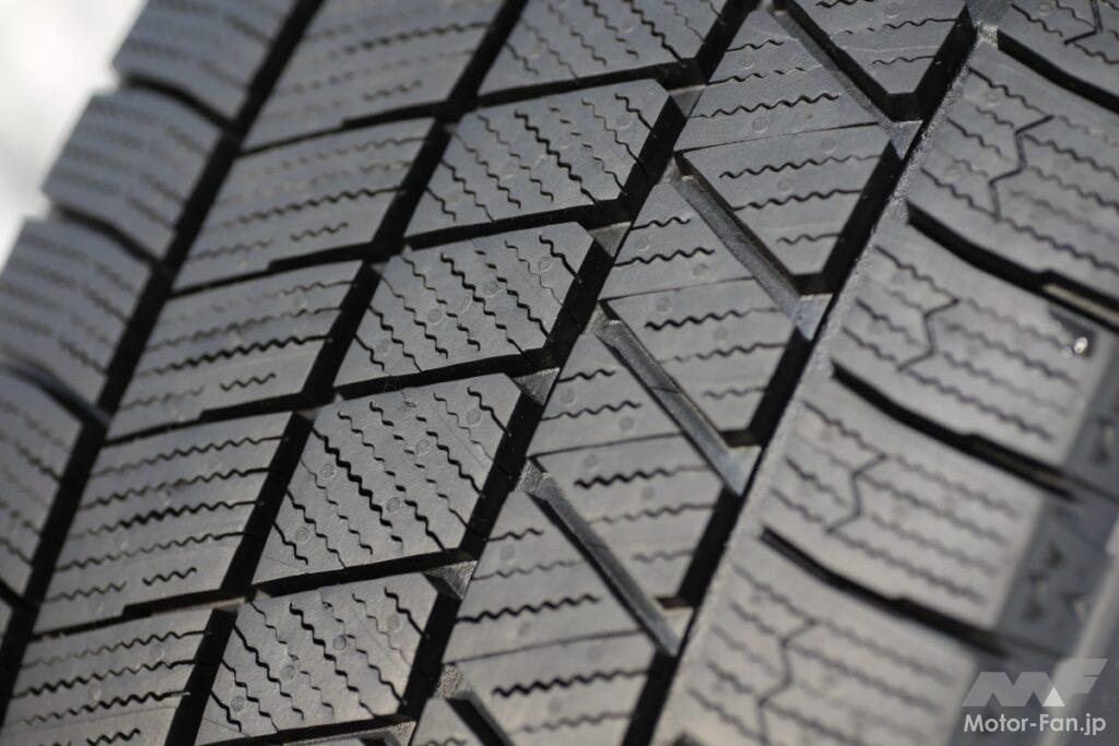 雪上、氷上路面でしっかり止まる、曲がる基本性能の高さのみならず、最新スタッドレスでは“タイヤの寿命”まで配慮されている点にも注目したい。タイヤが滑るとゴムの摩耗は早まる。そこでVRX3では、ブロックサイズの均一化を進めたうえで剛性を高めるなどし、タイヤと路面のすべりを低減。摩耗ライフを17%も向上している。