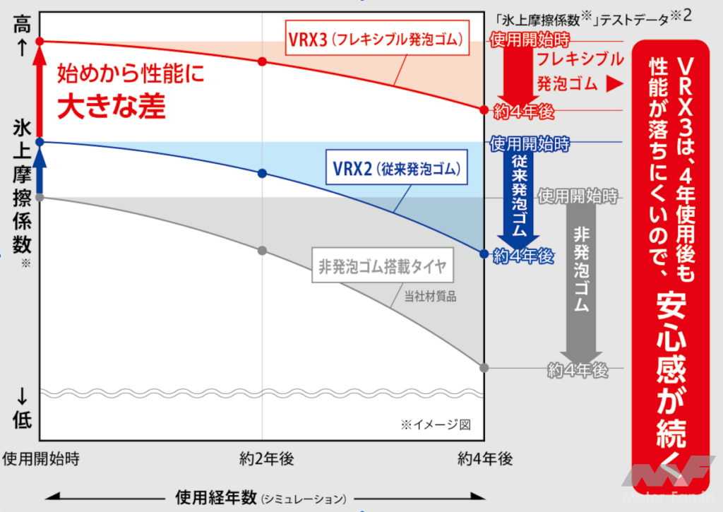 そこで、ブリザックVRX3で採用したフレキシブル発泡ゴムは、ロングスティブルポリマーを配合し、やわらかさを維持できる分子設計に。4年経過したゴムもやわらかく、凹凸がある氷上、雪上路面にしっかりと食いついてくれる。つまり、タイヤが減りにくく、なおかつ性能の落ち幅も少ない。より安全だし、財布にもやさしいということだ。