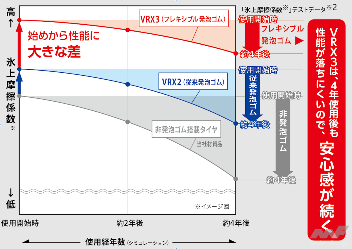 そこで、ブリザックVRX3で採用したフレキシブル発泡ゴムは、ロングスティブルポリマーを配合し、やわらかさを維持できる分子設計に。4年経過したゴムもやわらかく、凹凸がある氷上、雪上路面にしっかりと食いついてくれる。つまり、タイヤが減りにくく、なおかつ性能の落ち幅も少ない。より安全だし、財布にもやさしいということだ。