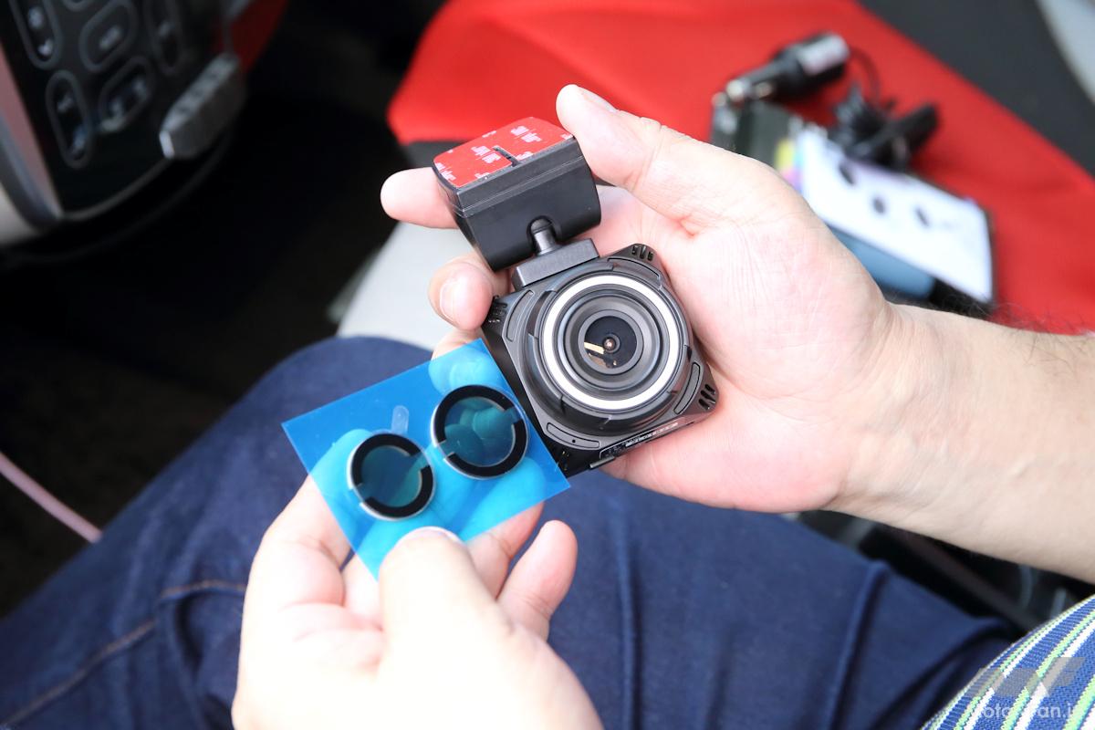 今回テストで使用したドラレコは、同社のコンパクトモデル『AN-R109』。レンズとフィルターのサイズがピッタリでキレイに装着できた。しかしながら機種によっては貼り付け部が曲面だったり、レンズ周囲に突起物がある場合には装着不可なので注意が必要だ。貼り付けるときはスリットが上下になるように注意して,保護シールをはがせば準備OK。大小2枚セットになっており 2カメラドラレコにも対応できる点はうれしい限りだ。