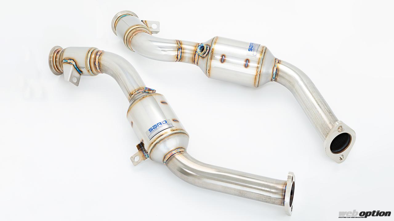 純正では2-1レイアウトとなる第一触媒から中間までのパイプは、排気効率を高めるために60φのフルデュアルで構成。左右バンクを別々で排気するフルデュアル構造とすることでパイプ径を抑え、ロードクリアランスを確保しながらも、なおかつ排気効率の向上を実現しているというわけだ。
