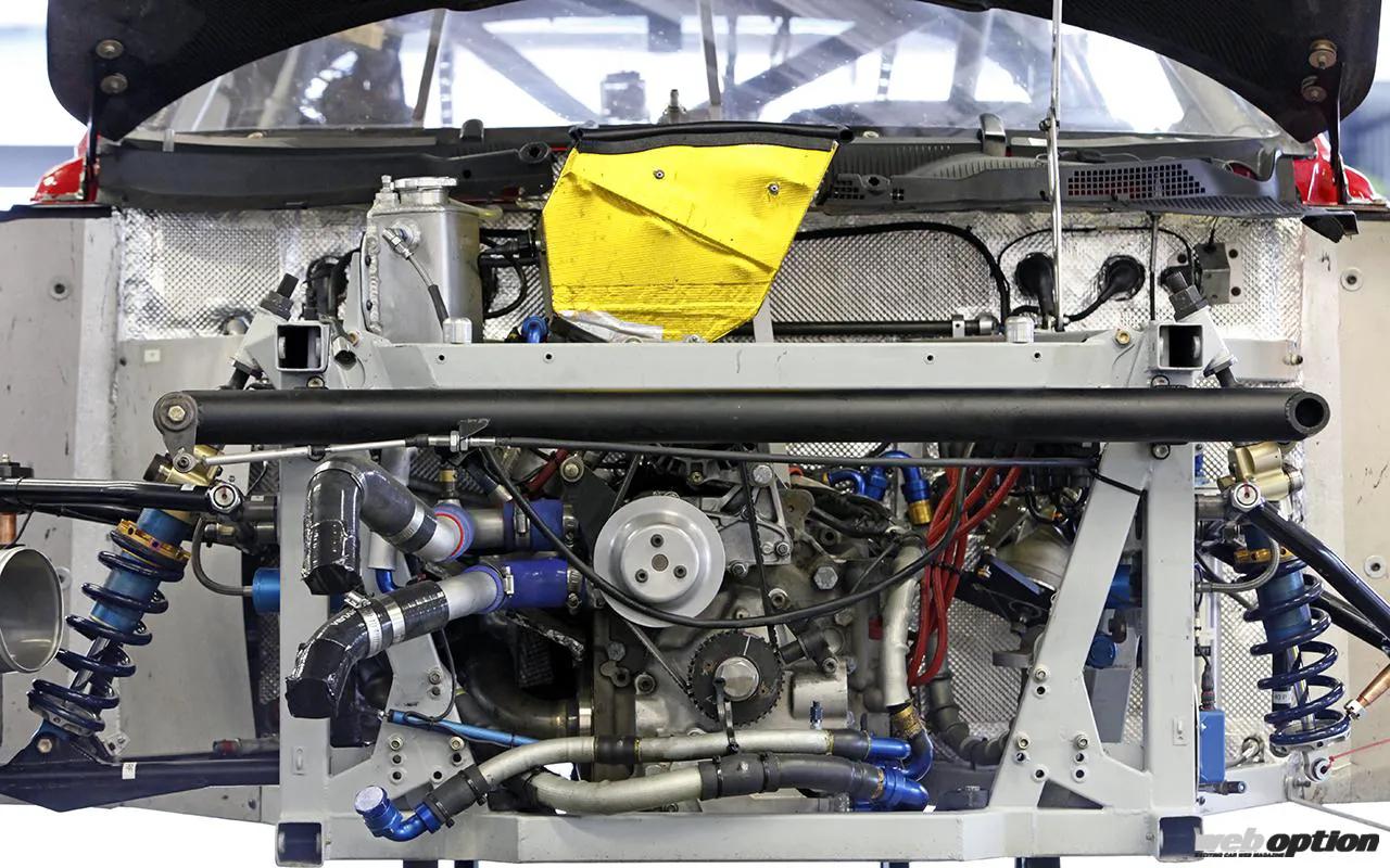 オールカーボンのボディシェイプはRX-8そのものだが、シャシーはスチールチューブによるスペースフレ—ム。この軽量シャシーのフロントに450psを発生する20Bを搭載し、デフとギアボックスを一体化したトランスアクスルをリアに配している。