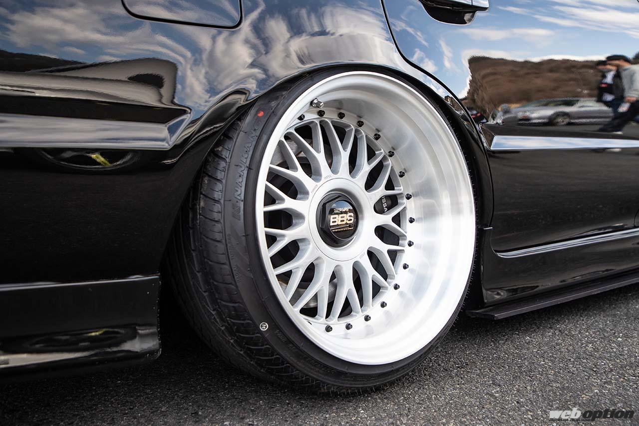 現在の仕様では、“黒いボディ・メッシュホイール・ブラッシュドリム”というシンプルな3要素を追求。そのコンセプトに則り、ホイールには超レアなインパル×BBSコラボモデルをリバレルしてインストール。これはインパルBBSのディスクに社外(アフターパーツ)のアウターリップを組み合わせたもので、本家では存在しないサイズを生み出すアメリカ発信のカスタム術だ。サイズはフロントが18×10Jマイナス3、リヤが18×10Jマイナス13。