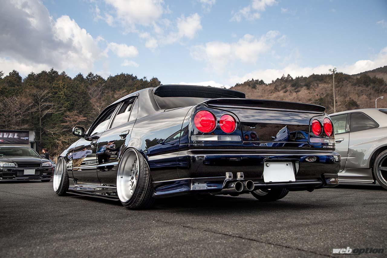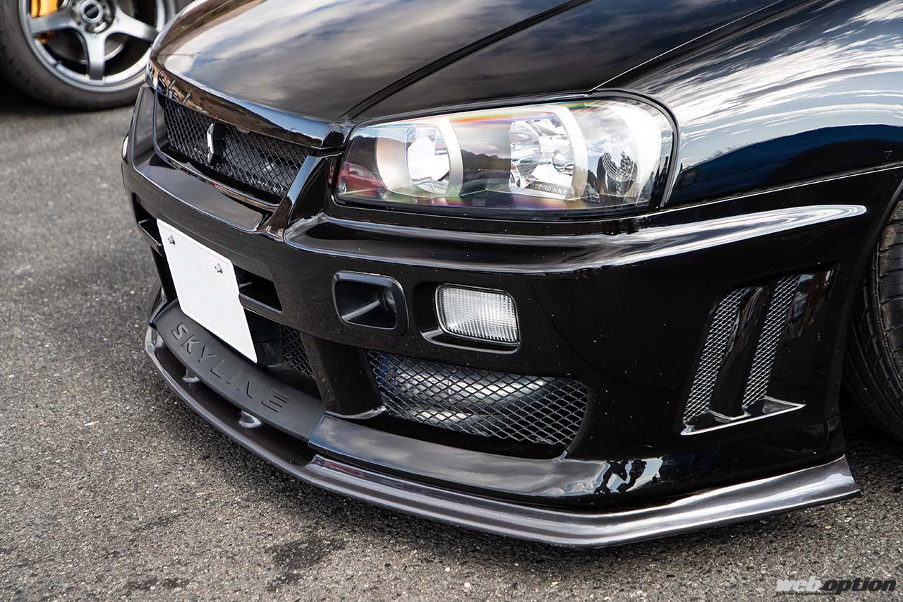 極太ホイールを押し込めるために、前後フェンダーはオーナー自らがワイド化を実行。拡幅はフロント片側20mm、リヤ片側15mmとのこと。足回りは、レーシングギア製の車高調にハードレートのスプリング(Fスウィフト34kg/mm Rマックス12kg/mm)を合わせて、実用性も兼ね備えたシャコタンスタイルを構築している。実際、オーナーはこのER34で日々の通勤もこなしているそうだ。
