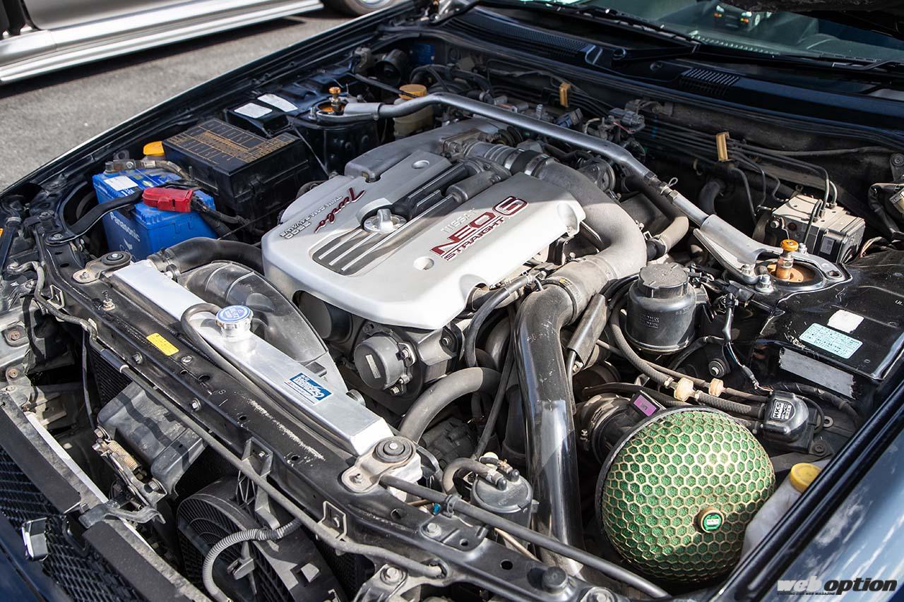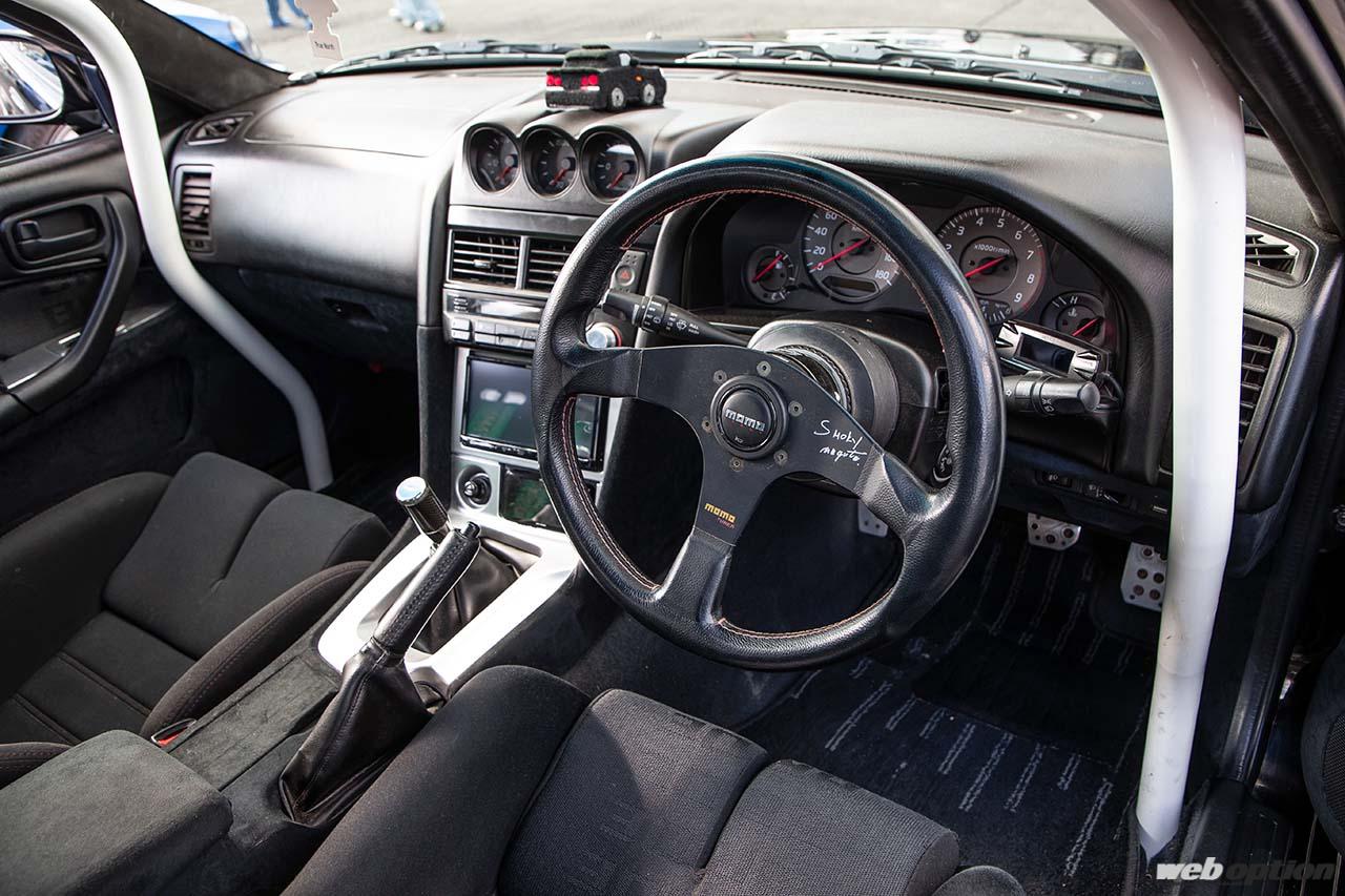 心臓部のRB25DETエンジンは、本体ノーマルのまま吸排気系に手を入れたブーストアップ仕様となる。最高出力は約300psだ。エンジンルーム内の美しさからも、車両状態の良さが伺えるというものだ。