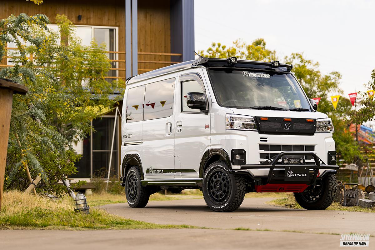 実際には35㎜しか車高がアップしていないのに、純正フロントバンパーのショート化や、アンダーガード、オフタイヤなどによって、実サイズ以上にリフトアップしているように見えるのが「アゲバン」仕様のアトレー。バータイプのフロントバンパーガードに付属するショートタイプのリップがキモで、これを純正バンパー下部のリップと交換することで、地面との距離を確保。見た目の車高アップ化を図っている。またサイドがワイルドになるオーバーフェンダーも幅9㎜なので車検も問題なし。車高・車幅など車検の範囲内でカスタムしているので、安心して普段使いできるのもカースタイルのカスタムのポイント。デモカーではルーフをブラックアウトしているのだが、これはハイルーフ特有のルーフの重さを解消する手段。そんなカスタム手法も非常に参考になる。
