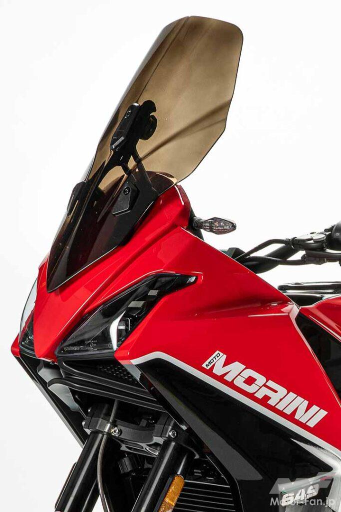 フロントにはロングツーリングでの快適性を高める、防風性に優れた大型のスクリーン(片手で簡単に高さ調整が可能)を装備。ハンドルポスト固定型のバータイプを採用したアップハンドルや、フルLEDのデュアルヘッドライトとの組み合わせにより、精悍なフロントマスクへと導いている。