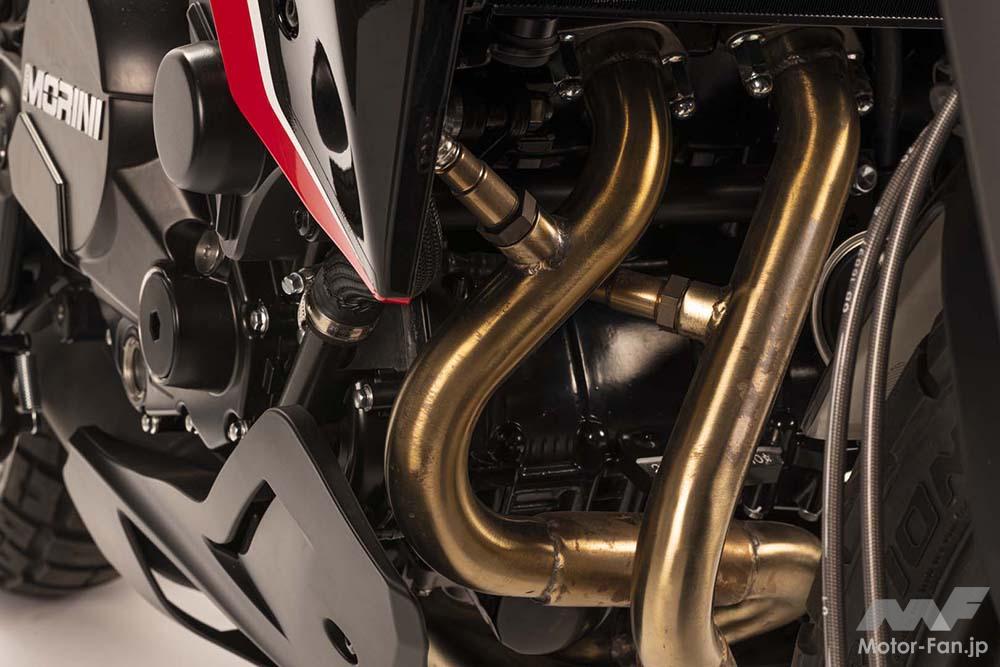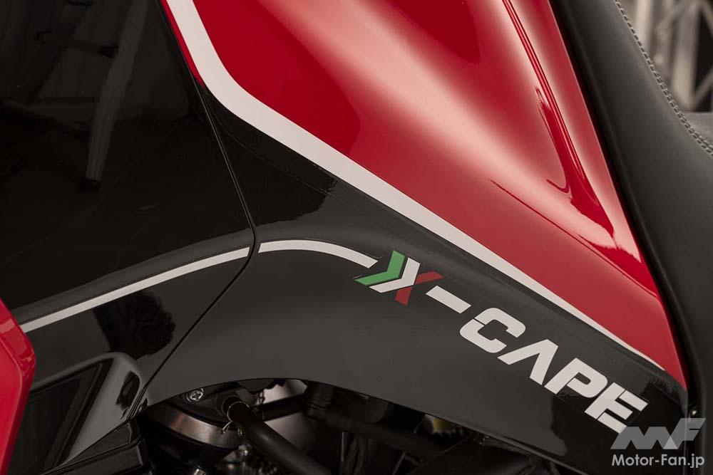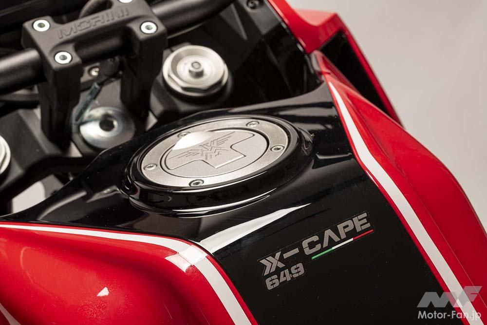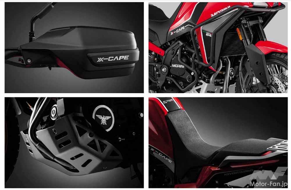 1937年に設立された、イタリアのバイクブランド「モトモリーニ」が開発したNEWモデル・X-CAPEは、水冷4ストローク並列2気筒DOHC 4バルブ649ccのパラレルツインエンジン(ユーロ5に適合)を搭載した、ミドルクラスのアドベンチャーモデル。最大出力は44kW(59.8ps)/8250rpm、最大トルクは56Nm/7000rpmを発揮。